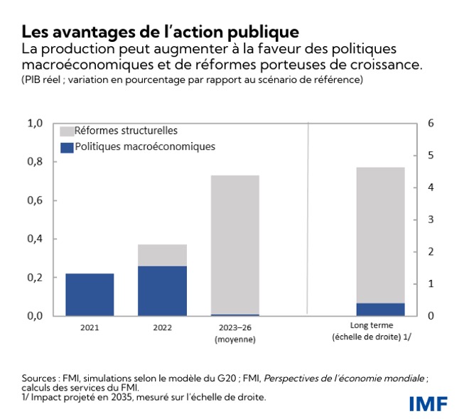 Ensuite, des réformes structurelles propices à la croissance pourront apporter l’essentiel des gains supplémentaires, par exemple des politiques du marché du travail qui facilitent la recherche d’un emploi et la reconversion professionnelle, ou des réformes des réglementations des marchés de produits qui créent des débouchés pour les nouvelles entreprises en réduisant les obstacles à l’entrée sur le marché. Un tel ensemble de mesures à court et à moyen terme pourrait accroître le PIB réel global des pays du G20 d’environ 4 900 milliards de dollars d’ici à la fin de 2026.