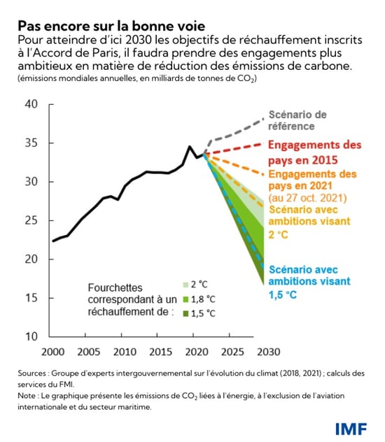 Une nouvelle analyse du FMI laisse apparaître des insuffisances quant à l’ambition et aux mesures qui s’imposent pour réaliser des réductions d’émissions de nature à limiter le réchauffement de la planète.