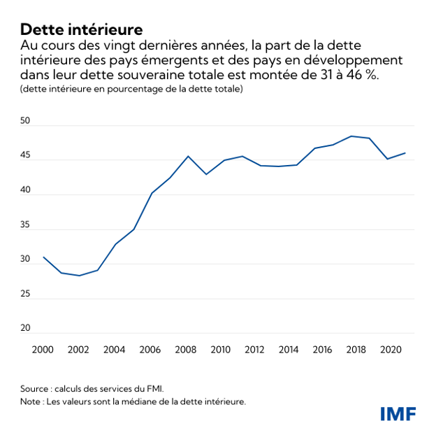 En vingt ans, les pays émergents et les pays en développement ont vu la part de leur dette souveraine intérieure — appelons-la « dette intérieure » pour faire court — dans leur dette souveraine totale passer de 31 à 46 %. On peut donc penser que la restructuration de la dette intérieure interviendra dans la résolution des futures crises de la dette. Un nouveau document des services du FMI s’appuie sur les 40 dernières années de restructuration de la dette souveraine pour apporter des éclairages sur les considérations essentielles à prendre en compte pour qu’une restructuration de la dette intérieure rétablisse la viabilité de la dette avec un minimum de perturbations.