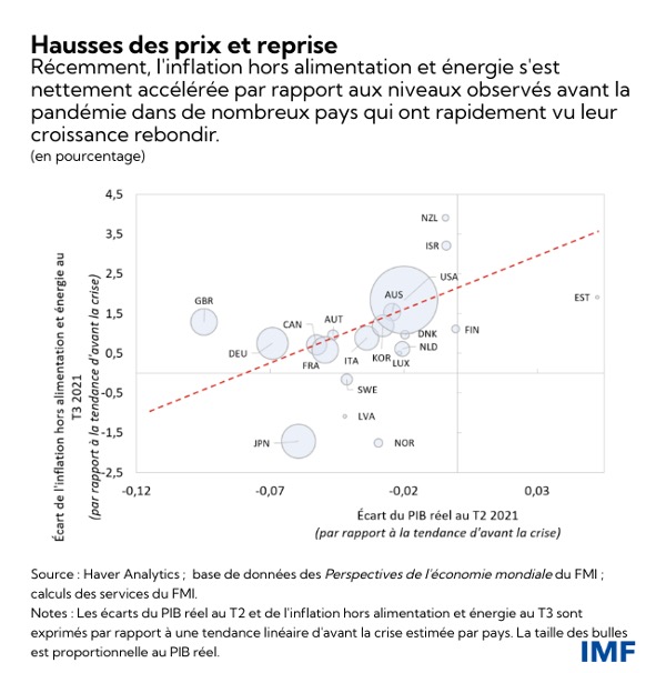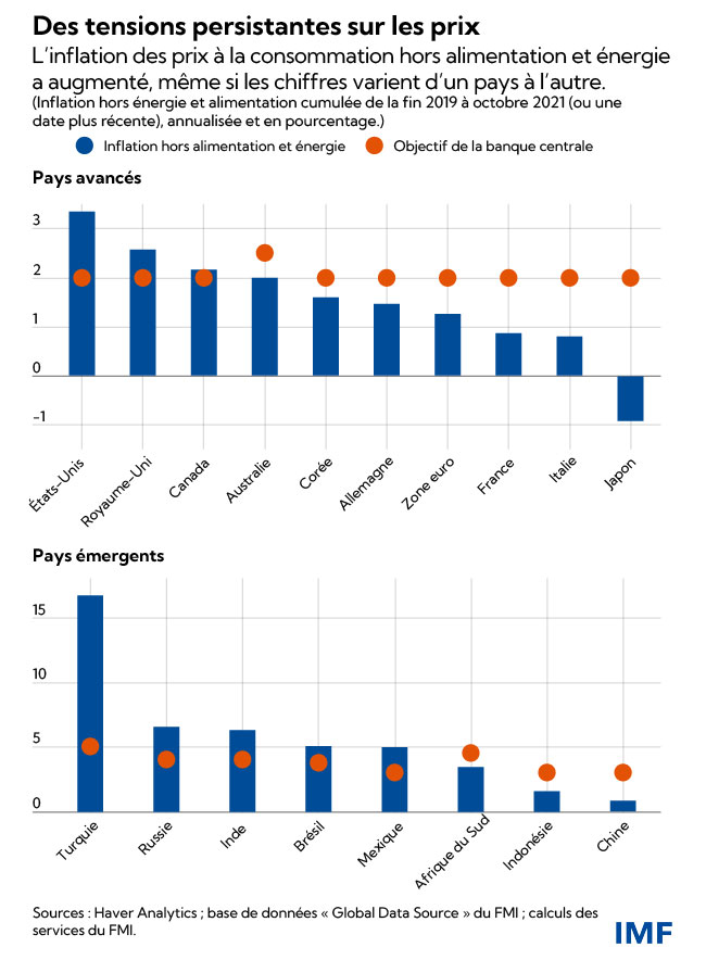 Si les pressions inflationnistes venaient à se généraliser dans d’autres pays, davantage d’États devraient durcir leur politique monétaire plus tôt que prévu. Dans ce contexte, il est essentiel que les principales banques centrales orchestrent soigneusement la communication de leurs mesures, de façon à ne pas créer un vent de panique sur les marchés, qui aurait des effets délétères non seulement à l’intérieur du pays, mais aussi à l’étranger, en particulier dans des pays émergents et en développement très endettés. Il va sans dire que, compte tenu du haut degré d’incertitude, notamment autour du variant Omicron, les décideurs devraient rester alertes, se fier aux données et se tenir prêts à ajuster leur trajectoire si besoin.
