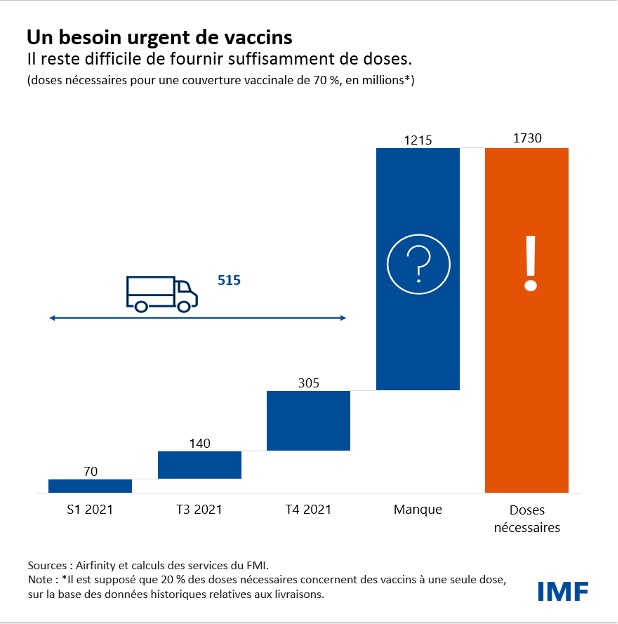 L’année dernière, les services du FMI ont proposé un plan d’éradication de la pandémie, qui prévoyait de vacciner 40 % de la population de tous les pays d’ici à la fin de 2021 et 70 %[1] d’ici à la mi-2022. Les progrès sont spectaculaires, mais il faut faire mieux. Il est alarmant de constater que la distribution de vaccins et d’autres moyens se poursuit à deux vitesses radicalement différentes. En Afrique, par exemple, seuls sept pays ont atteint l’objectif de 40 % en 2021 et, pour beaucoup, l’objectif de 70 % semble de plus en plus ambitieux.