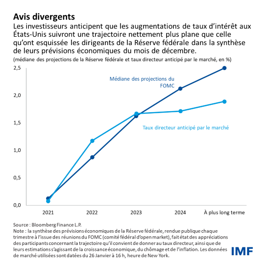 Si les taux du marché à plus court terme ont grimpé depuis que les banques centrales ont adopté un ton offensif dans les pays avancés et dans certains pays émergents, on observe encore une différence notable entre les anticipations des autorités concernant le niveau que leurs taux directeurs atteindront et celles des investisseurs portant sur l’ampleur définitive du resserrement.