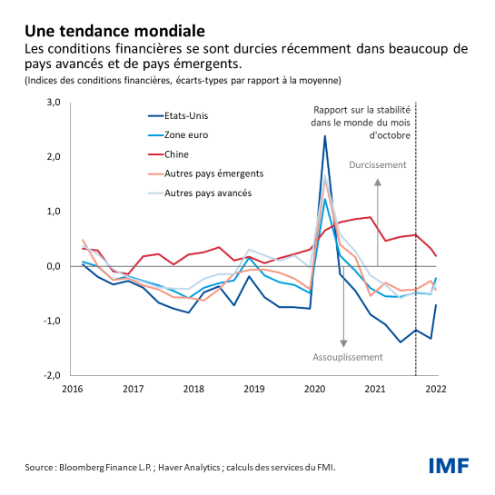 Face à la persistance de l’inflation, les banques centrales vont devoir se livrer à un exercice d’équilibrage. Pendant ce temps, les taux d’intérêt réels demeurent très bas dans de nombreux pays. Le durcissement de la politique monétaire doit aller de pair avec un certain resserrement des conditions financières. Cependant, un net resserrement des conditions financières mondiales pourrait avoir des conséquences imprévues. Une hausse plus marquée et brusque des taux d’intérêt réels pourrait éventuellement entraîner une réévaluation des cours source de perturbations et un effondrement des actions encore plus marqué. Comme les risques financiers restent élevés dans plusieurs secteurs, les autorités monétaires devraient donner des indications claires sur la future orientation de leur politique afin d’éviter une volatilité inutile et de préserver la stabilité financière.
