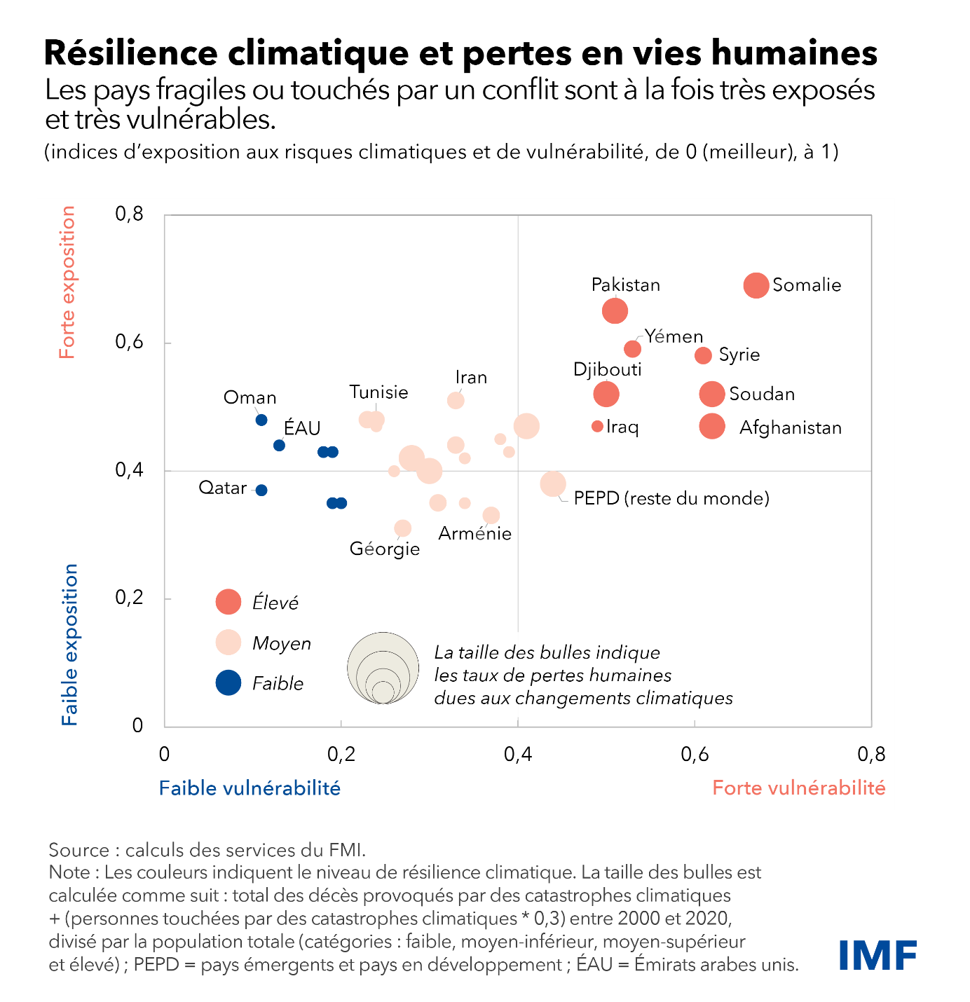 Un pays est peu résilient face aux changements climatiques s’il est à la fois exposé aux aléas climatiques et vulnérable à leur égard. Ces pays, qui comprennent notamment des pays fragiles ou en proie à des conflits tels que l’Afghanistan, la Somalie et le Soudan, ainsi que le Pakistan, pays à revenu intermédiaire de la tranche inférieure, sont gravement touchés et comptent davantage de décès et de sinistrés.