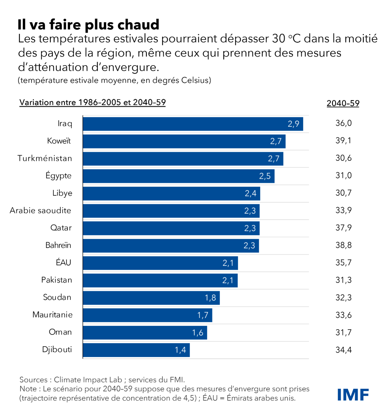 Une élévation des températures de 1 degré Celsius dans cinq des pays les plus chauds (Bahreïn, Djibouti, Émirats arabes unis, Mauritanie et Qatar) provoque immédiatement une chute de la croissance économique par habitant de l’ordre de 2 points de pourcentage.