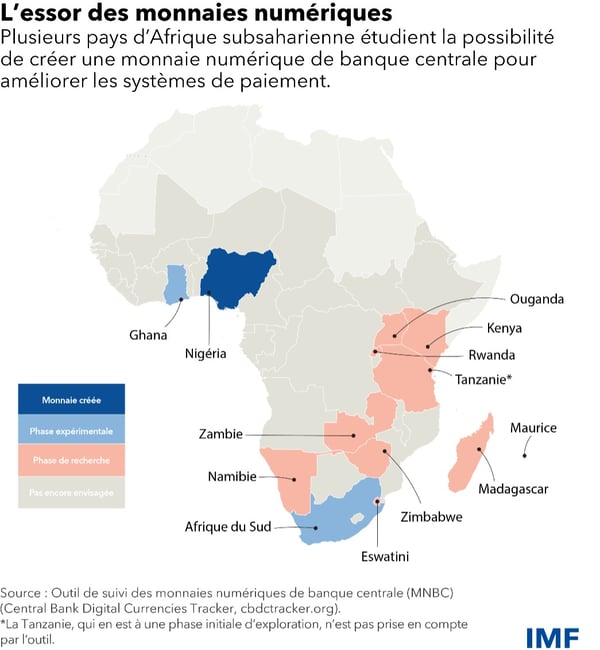 L’inflation est au centre des préoccupations. À la suite de l’introduction du eNaira par le Nigéria en octobre dernier, plusieurs banques centrales d’Afrique subsaharienne étudient la possibilité de créer une monnaie numérique ou ont déjà lancé une monnaie de ce type à titre expérimental. Après les Bahamas, le Nigéria est le deuxième pays du monde à émettre une monnaie numérique de banque centrale (MNBC).