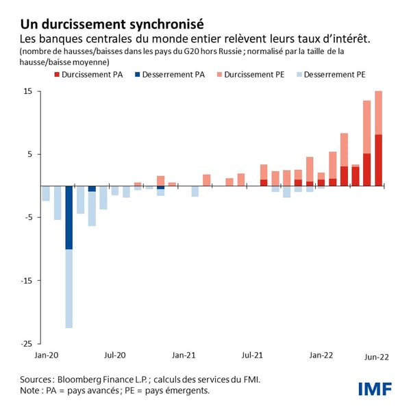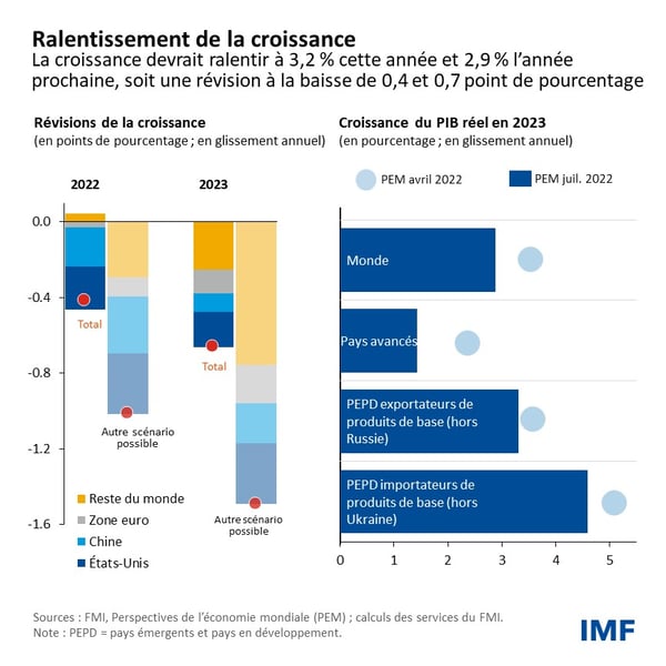 Une inflation plus forte que prévu, en particulier aux États-Unis et dans les pays européens les plus importants économiquement, provoque un durcissement des conditions financières mondiales. En Chine, le ralentissement a été plus prononcé qu’attendu sur fond de flambées de COVID-19 et de confinements, et la guerre en Ukraine a eu de nouvelles répercussions négatives. La production mondiale s’est donc contractée au deuxième trimestre de cette année.