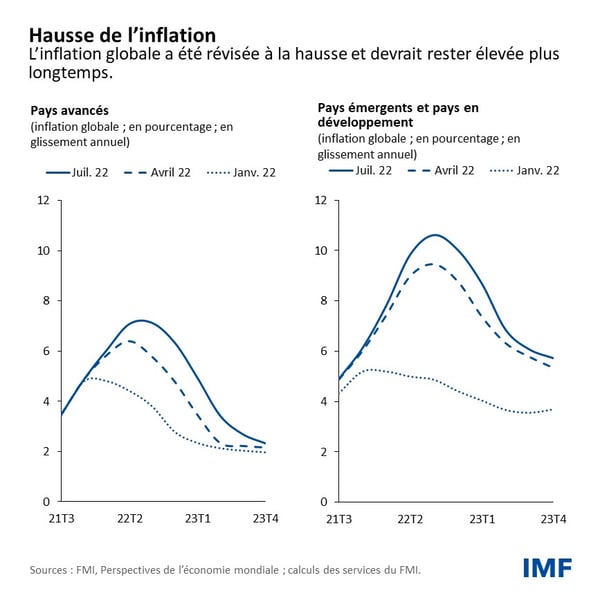 Bien que l’activité ralentisse, l’inflation mondiale a été révisée à la hausse, en partie du fait de l’augmentation des prix des denrées alimentaires et de l’énergie. L’inflation devrait atteindre cette année 6,6 % dans les pays avancés et 9,5 % dans les pays émergents et les pays en développement, soit une révision à la hausse de 0,9 et 0,8 point de pourcentage, respectivement, et elle devrait rester élevée plus longtemps. Elle s’est en outre étendue à de nombreux pays sous l’effet des tensions sur les prix provoquées par les perturbations des chaînes d’approvisionnement et une pénurie de main-d’œuvre historiquement forte.