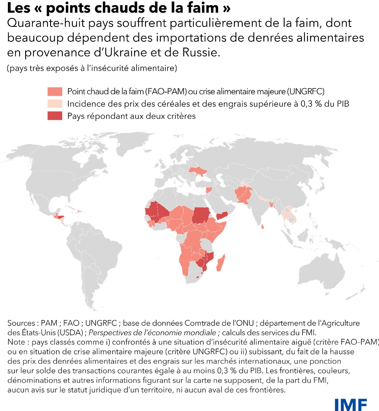 Les effets du choc alimentaire se font sentir partout, mais de façon plus marquée dans 48 pays, dont beaucoup sont fortement dépendants des importations en provenance d’Ukraine et de Russie, pour la plupart des pays à faible revenu. Parmi ceux-ci, environ la moitié sont particulièrement vulnérables en raison de graves difficultés économiques, de la faiblesse de leurs institutions et de leur fragilité.