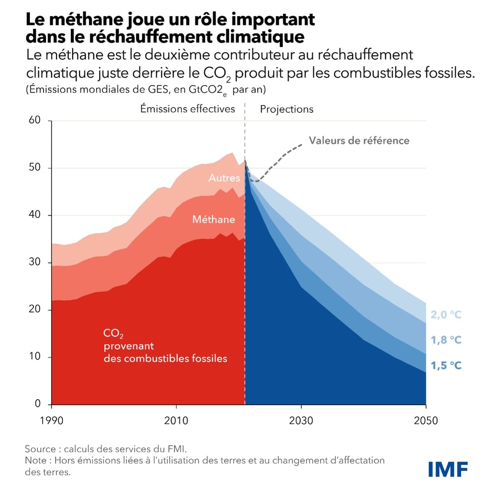 Comme le montre le graphique de la semaine, les émissions de gaz à effet de serre doivent chuter, d’ici 2030, de 25 % à 50 % par rapport à leurs niveaux en 2019 pour limiter le réchauffement climatique à 1,5-2 degrés Celsius, objectif central de l’Accord de Paris. Un recul des émissions de méthane pourrait faire baisser le stock de gaz à effet de serre dans l’atmosphère et diminuer les risques effrayants présentés par les « points de bascule », à partir desquels les changements climatiques s’auto-entretiennent. L’importance du méthane tient au fait qu’il ne reste dans l’atmosphère que 12 ans en moyenne alors que le CO2 peut y persister jusqu’à 1 000 ans.