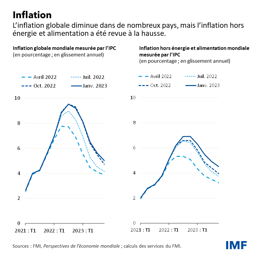 La croissance économique a fait preuve d’une résilience inattendue au troisième trimestre de l’année dernière, grâce à la vigueur du marché du travail, à la bonne tenue de la consommation des ménages et des investissements des entreprises, et à une adaptation qui s’est révélée plus solide que prévu à la crise énergétique en Europe. La situation de l’inflation s’est également améliorée, et les mesures globales prises par la plupart des pays sont désormais réduites. Cependant, l’inflation sous-jacente, qui exclut les prix plus volatils de l’énergie et des denrées alimentaires, n’a pas encore atteint son pic dans de nombreux pays.