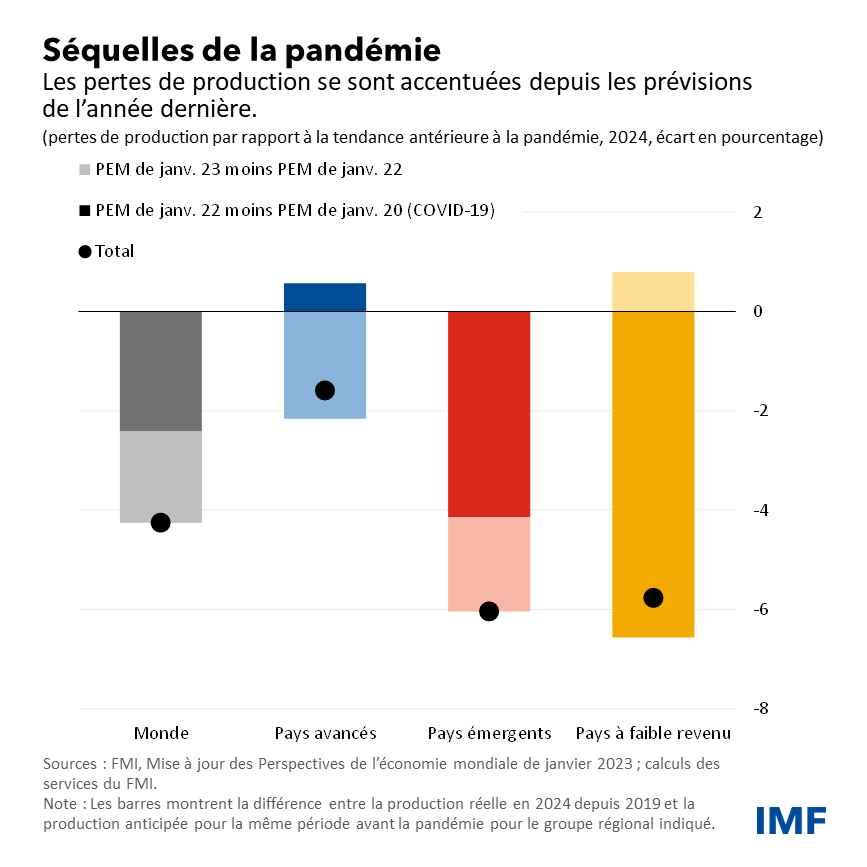 Des mesures relatives à l’offre ont également un rôle à jouer. Elles peuvent contribuer à lever les principales contraintes de croissance, à améliorer la résilience, à atténuer les pressions sur les prix et à favoriser la transition écologique. Cela permettrait d’atténuer les pertes de production cumulées depuis le début de la pandémie, en particulier dans les pays émergents et les pays à faible revenu.