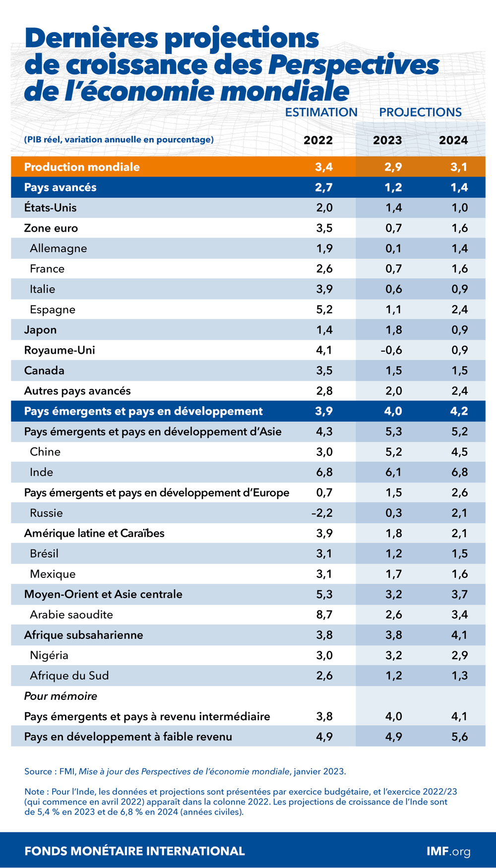 L’Inde fait toujours office d’heureuse exception. Avec la Chine, elle contribuera à la moitié de la croissance mondiale cette année, contre seulement un dixième pour les États-Unis et la zone euro réunis. Selon les prévisions, l’inflation mondiale devrait diminuer cette année, mais même d’ici à 2024, la moyenne annuelle projetée de l’inflation globale et de l’inflation de hors énergie et alimentation restera supérieure aux niveaux enregistrés avant la pandémie dans plus de 80 % des pays.