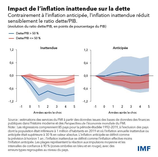 La principale conclusion de notre analyse de l’incidence de l’inflation sur les finances publiques est la suivante : une inflation inattendue, comme celle observée récemment, érode la valeur réelle de la dette publique, au détriment des détenteurs d’obligations. Pour les pays dont la dette dépasse 50 % du PIB, chaque augmentation inattendue (« surprise ») de 1 point de pourcentage de l’inflation réduit la dette publique de 0,6 point de pourcentage du PIB, l’effet durant plusieurs années.