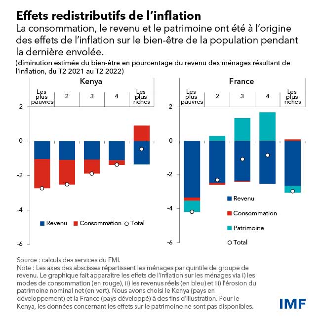 Sur la base d’enquêtes publiques réalisées auprès de milliers de ménages dans six pays (Colombie, Finlande, France, Kenya, Mexique et Sénégal), nous constatons que l’inflation entre la mi-2021 et la mi-2022 s’est répercutée sur les citoyens par trois canaux principaux : leurs modes de consommation, leurs revenus tirés des salaires, pensions ou transferts, et leurs actifs et passifs. Le graphique ci-dessous illustre les effets estimés de ces canaux sur un pays en développement (le Kenya) et sur un pays développé (la France), avant toute nouvelle intervention des pouvoirs publics pour venir en aide aux ménages.
