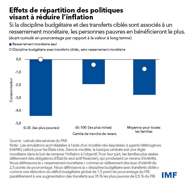 Le modèle économique utilisé dans ce chapitre intègre les inégalités en matière de revenus, de consommation et de détention d’actifs. Il met en évidence que, lorsque les banques centrales agissent seules, sans l’appui de la politique budgétaire, elles doivent relever sensiblement les taux d’intérêt pour lutter contre l’inflation. Un resserrement budgétaire permet de relever moins fortement les taux d’intérêt afin de contenir l’inflation.
