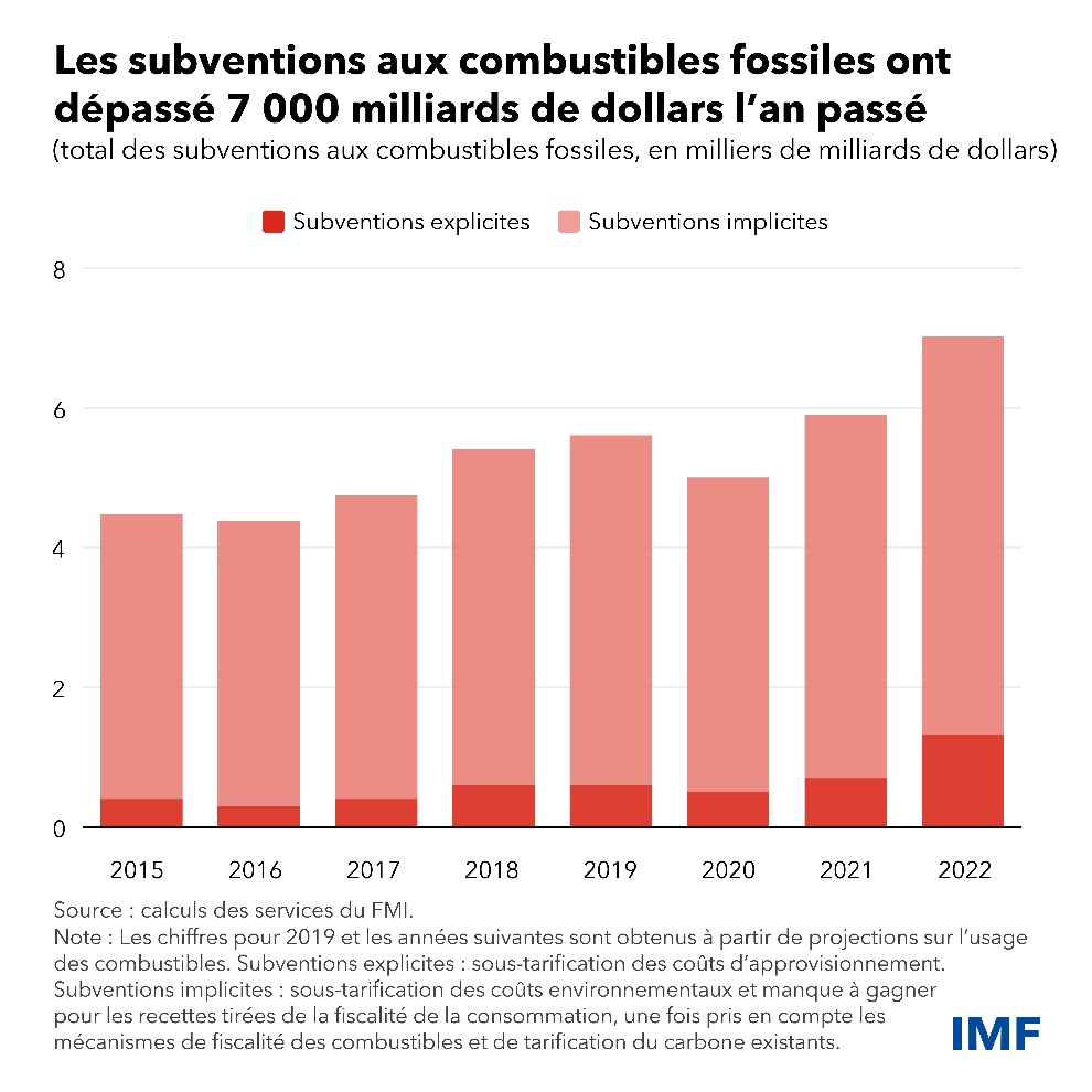 En accordant des aides aux consommateurs et aux entreprises pour leur permettre de faire face à la flambée mondiale des prix de l’énergie qu’a entraînée l’invasion de l’Ukraine par la Russie et pour favoriser le redressement de l’activité économique au lendemain de la pandémie, les pouvoirs publics ont fait fortement augmenter les subventions aux combustibles fossiles, qui ont atteint l’an passé le niveau record de 7 000 milliards de dollars.
