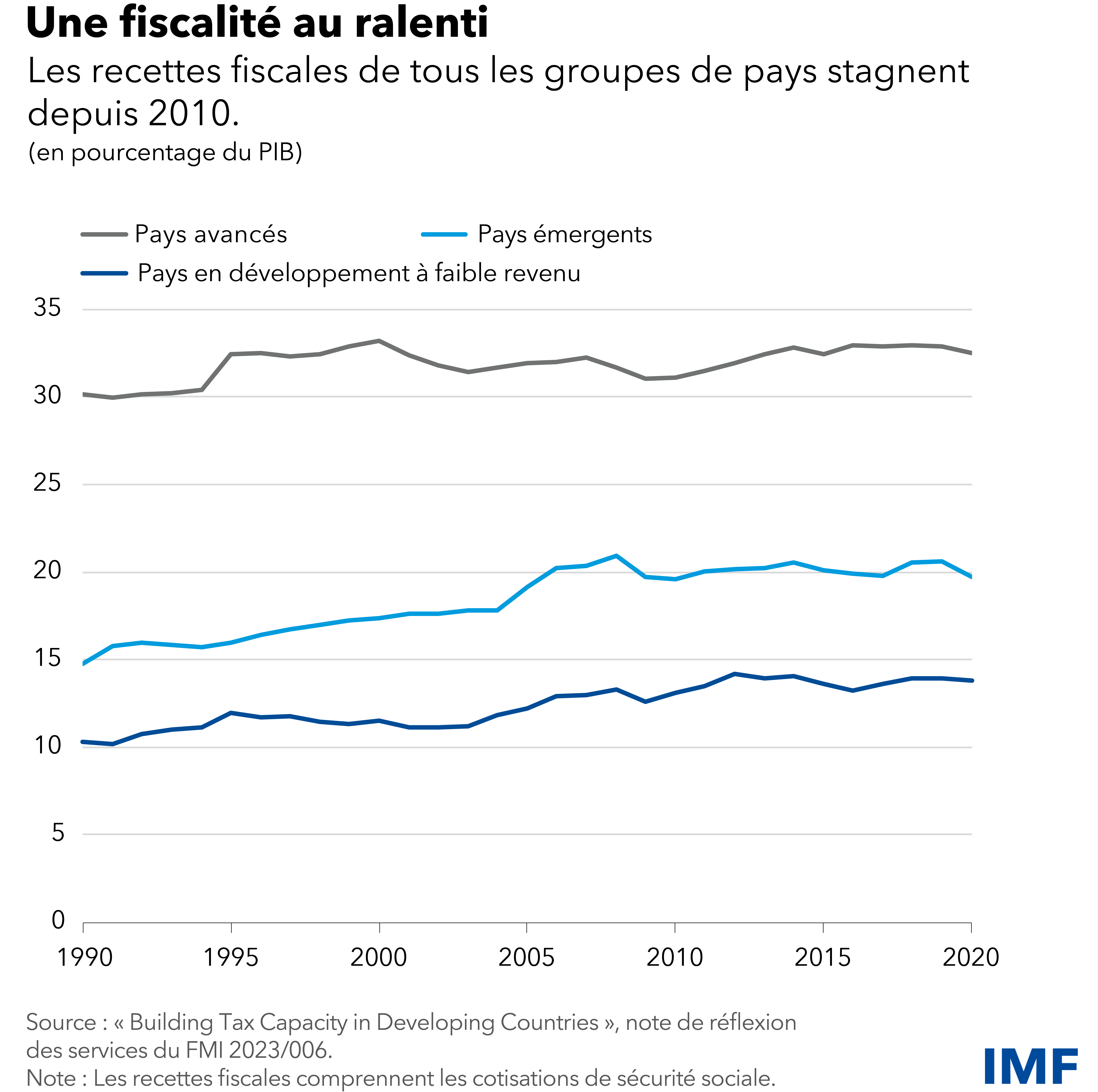 En outre, l’augmentation des recettes depuis le début des années 1990 a été très variable d’un pays à l’autre. La moitié des pays émergents et les deux tiers des pays à faible revenu avaient en 2020 un ratio impôts/PIB inférieur à 15 %, un point de bascule au‑dessus duquel il a été constaté que la croissance s’accélérait. En outre, les pays riches en ressources naturelles génèrent généralement moins de recettes fiscales, dans la mesure où certains États réduisent leurs impôts en raison de l’augmentation des recettes tirées des ressources naturelles.
