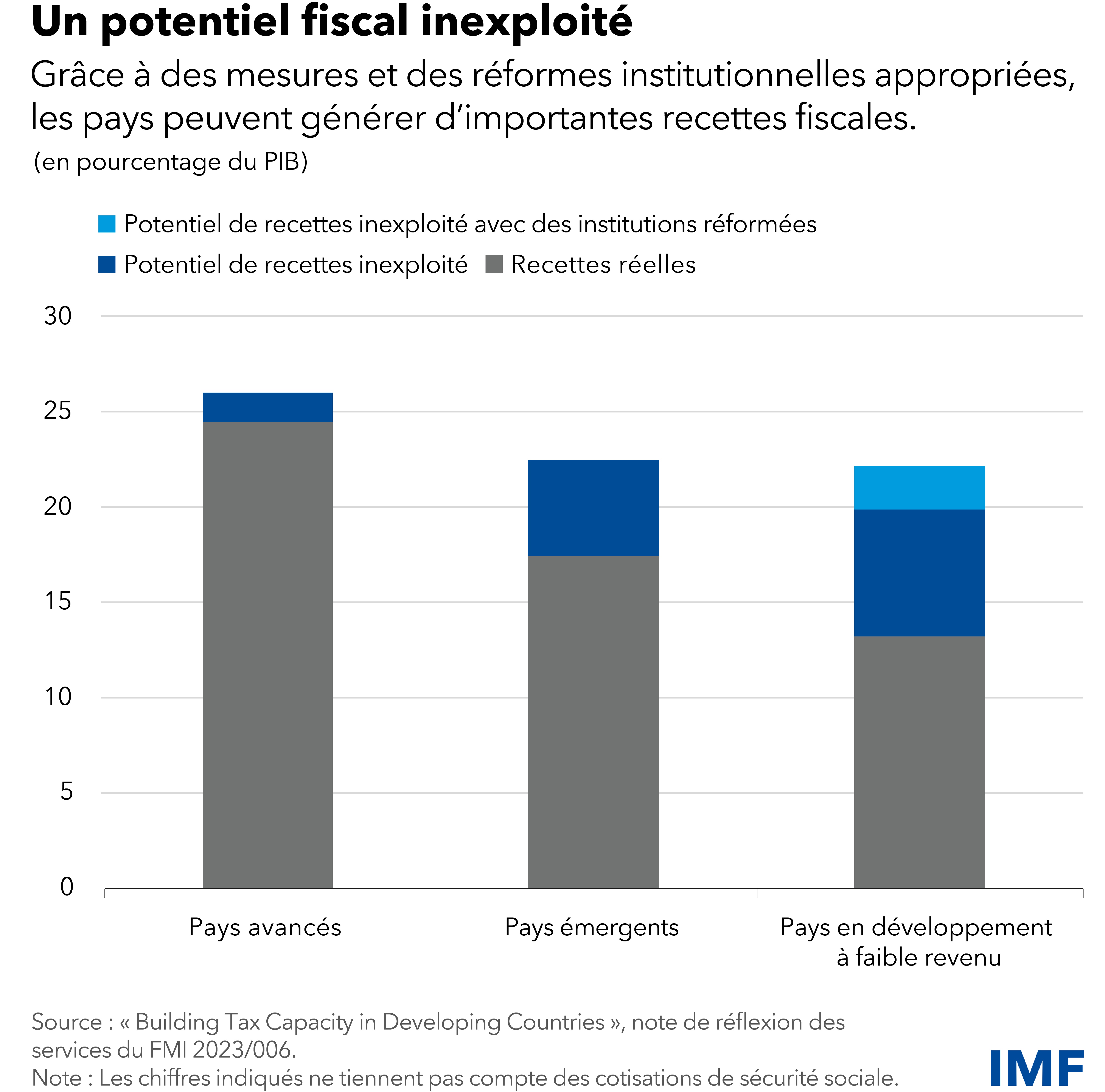 Les pays disposent d’une grande marge de manœuvre pour mobiliser davantage de recettes sur la base de leur potentiel fiscal, qui est le montant maximum que peut percevoir un pays compte tenu de sa structure économique et de ses institutions. Selon nos conclusions, les pays à faible revenu pourraient augmenter leur ratio impôts/PIB de 6,7 points de pourcentage en moyenne.