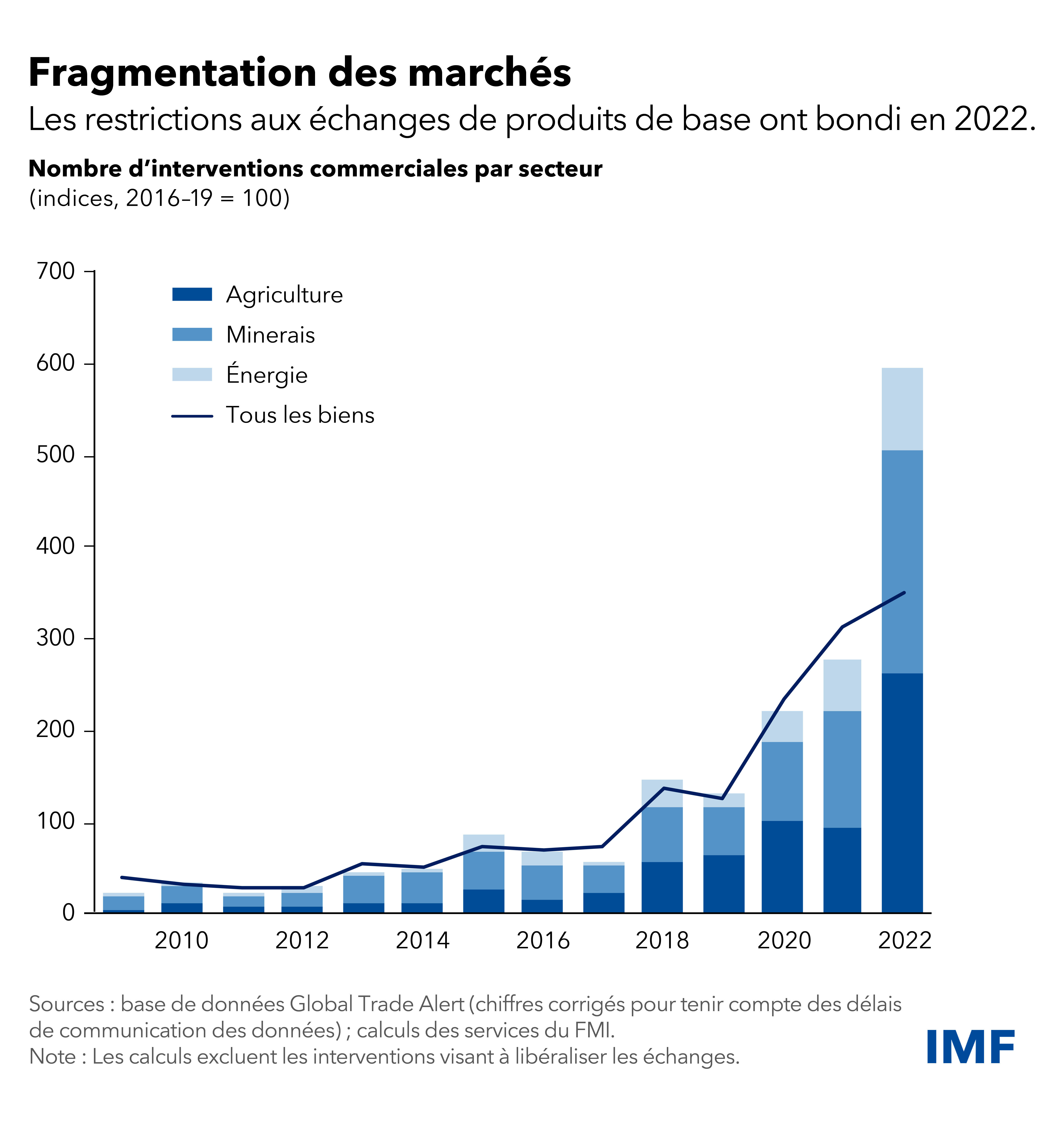 L’invasion de l’Ukraine par la Russie en 2022 a provoqué une fragmentation des principaux marchés des produits de base. Depuis lors, les pays ont restreint les échanges de produits de base, le nombre de nouvelles mesures prises par les pouvoirs publics ayant plus que doublé par rapport à 2021.
