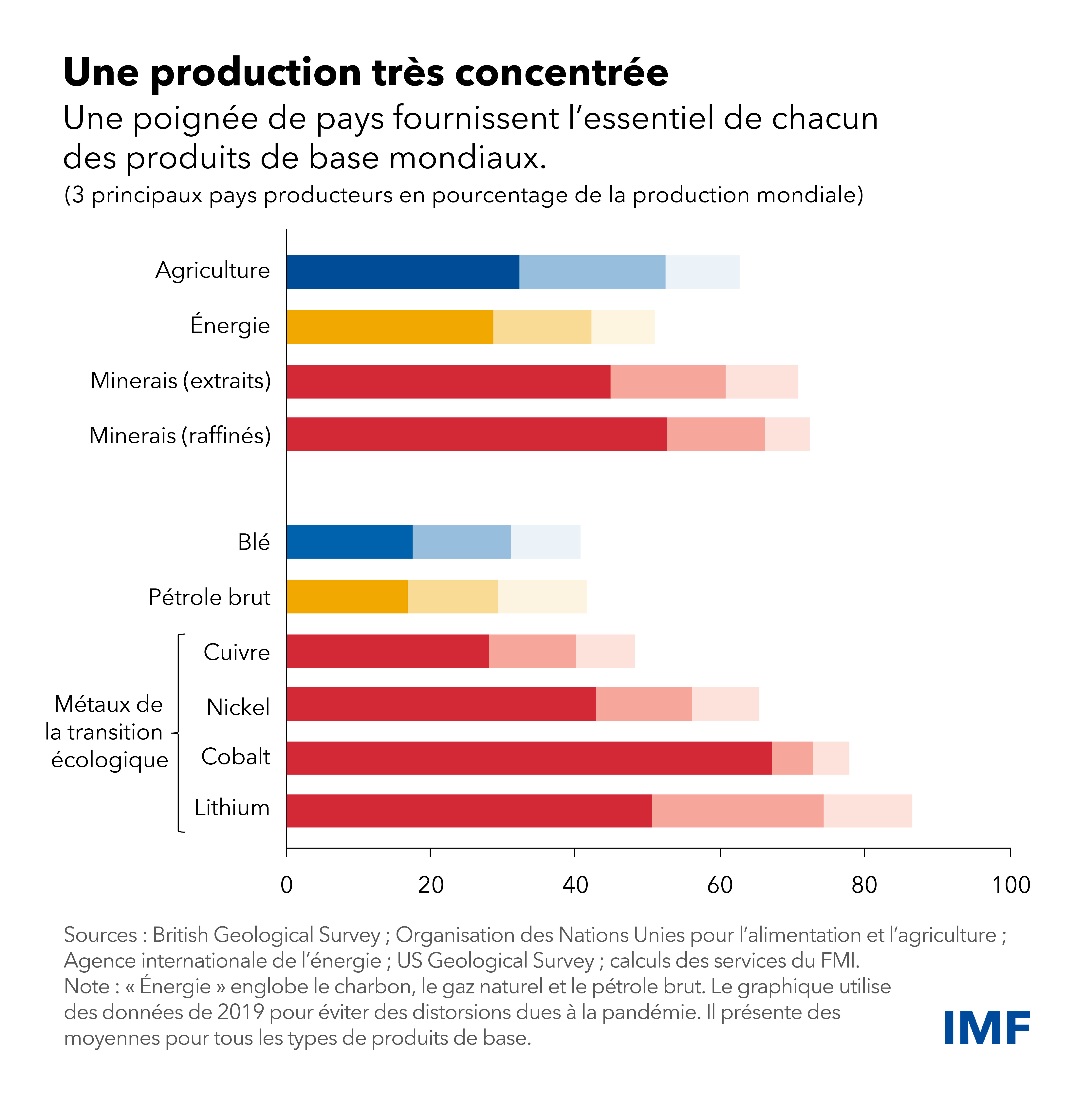 Ces effets négatifs s’expliquent en partie par une forte concentration de la production de produits de base, qui découle pour l’essentiel de l’abondance de ressources naturelles selon les régions. À titre d’exemple, les trois principaux fournisseurs de minerais représentent environ 70 % de la production minière mondiale en moyenne. Augmenter les capacités d’extraction et de transformation peut prendre des années, d’où la lenteur des réactions aux signaux-prix.