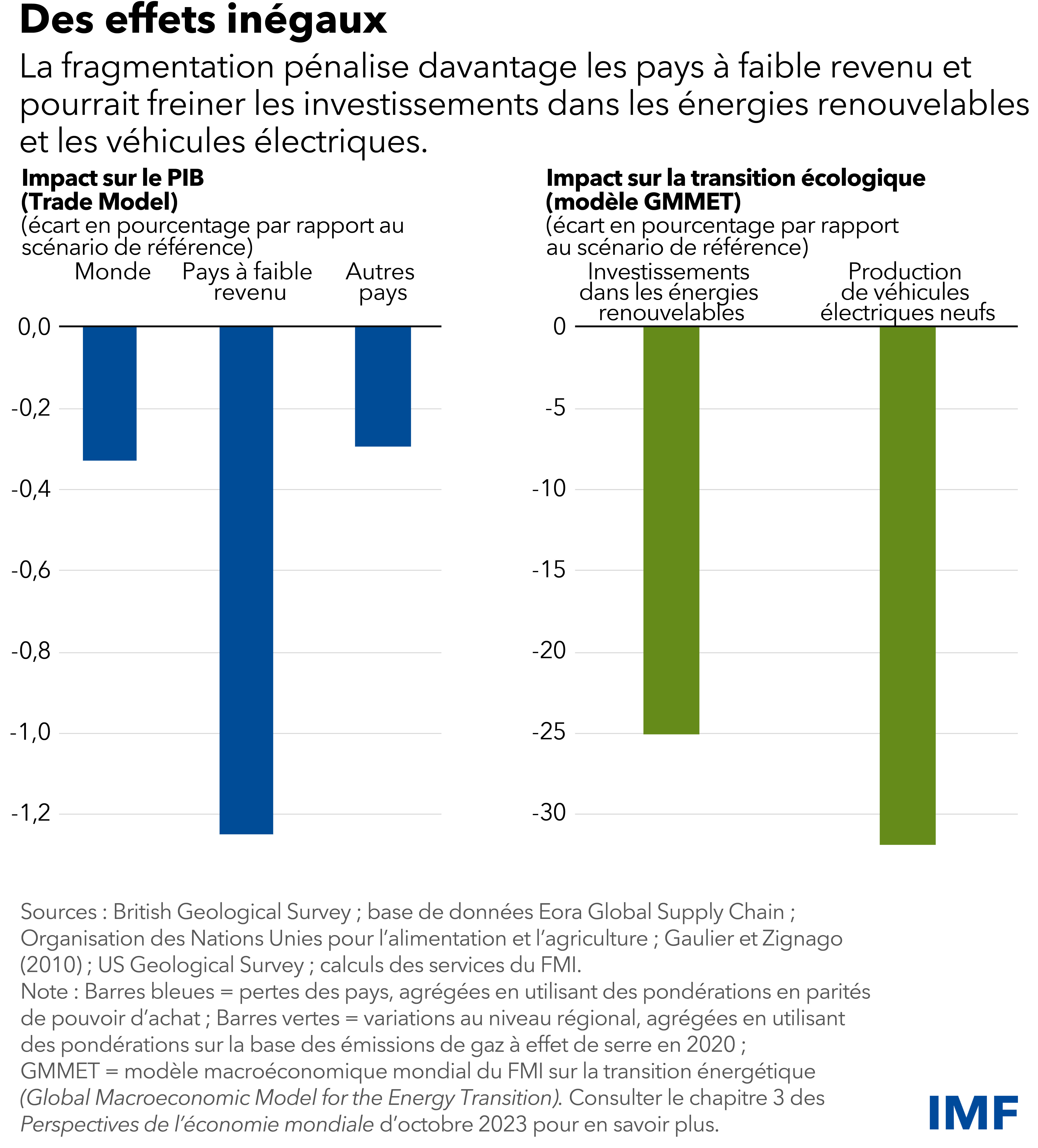 Dans notre scénario qui imagine une perturbation des échanges de minerais essentiels entre les blocs, d’ici à 2030, les investissements dans les énergies renouvelables et les véhicules électriques pourraient être inférieurs de 30 % par rapport à un scénario sans fragmentation. Cela pourrait ralentir le rythme de l’atténuation du changement climatique.