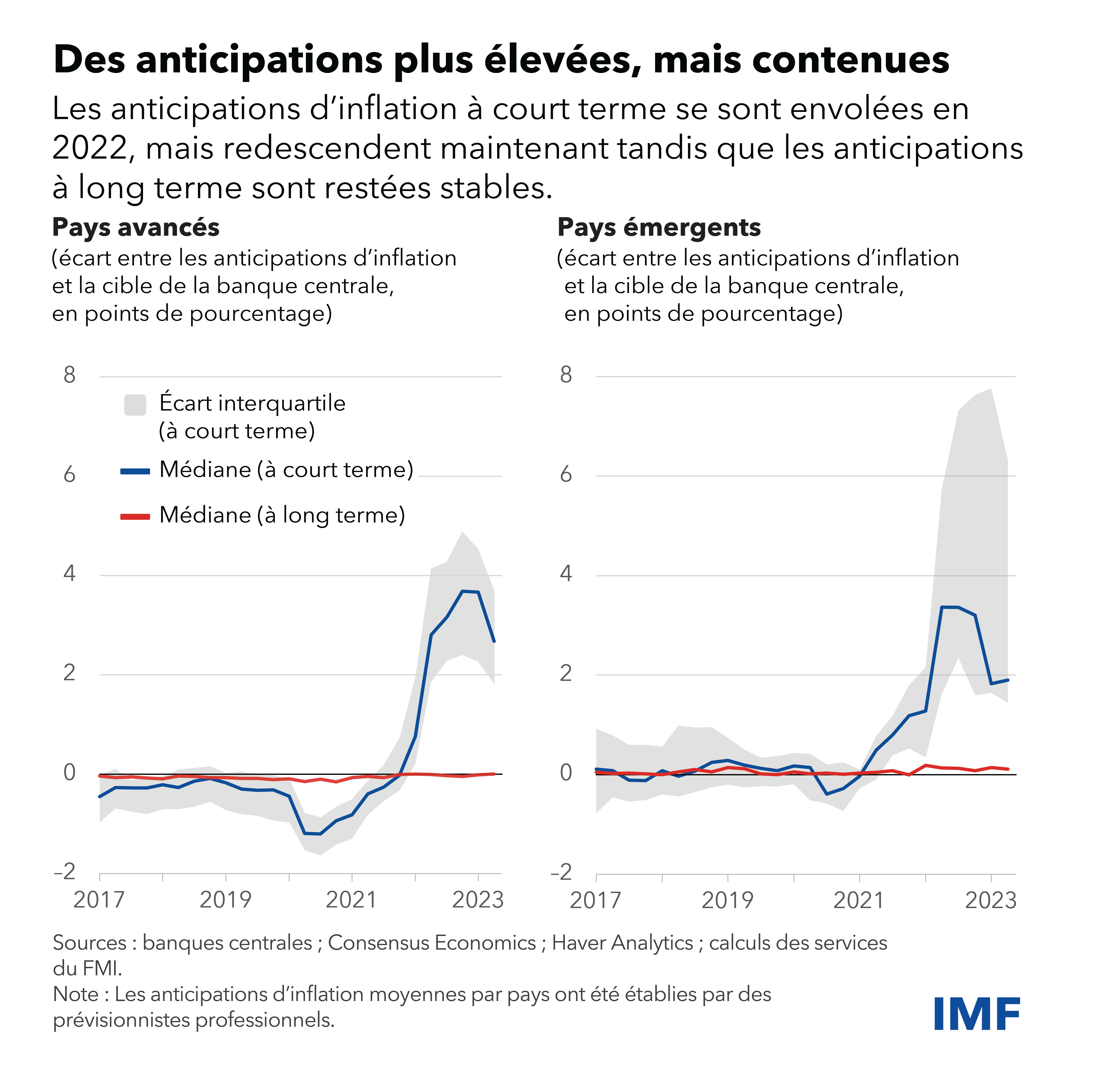 Des enquêtes menées auprès de prévisionnistes professionnels indiquent que les anticipations d’inflation pour les 12 prochains mois (anticipations à court terme) ont commencé à augmenter de façon régulière en 2021 tant dans les pays avancés que dans les pays émergents, avant de monter en flèche l’an dernier lorsque les hausses de prix effectives se sont accentuées. En revanche, les anticipations d’inflation à cinq ans sont restées stables, leurs niveaux moyens étant bien ancrés autour de l’objectif fixé par la banque centrale.