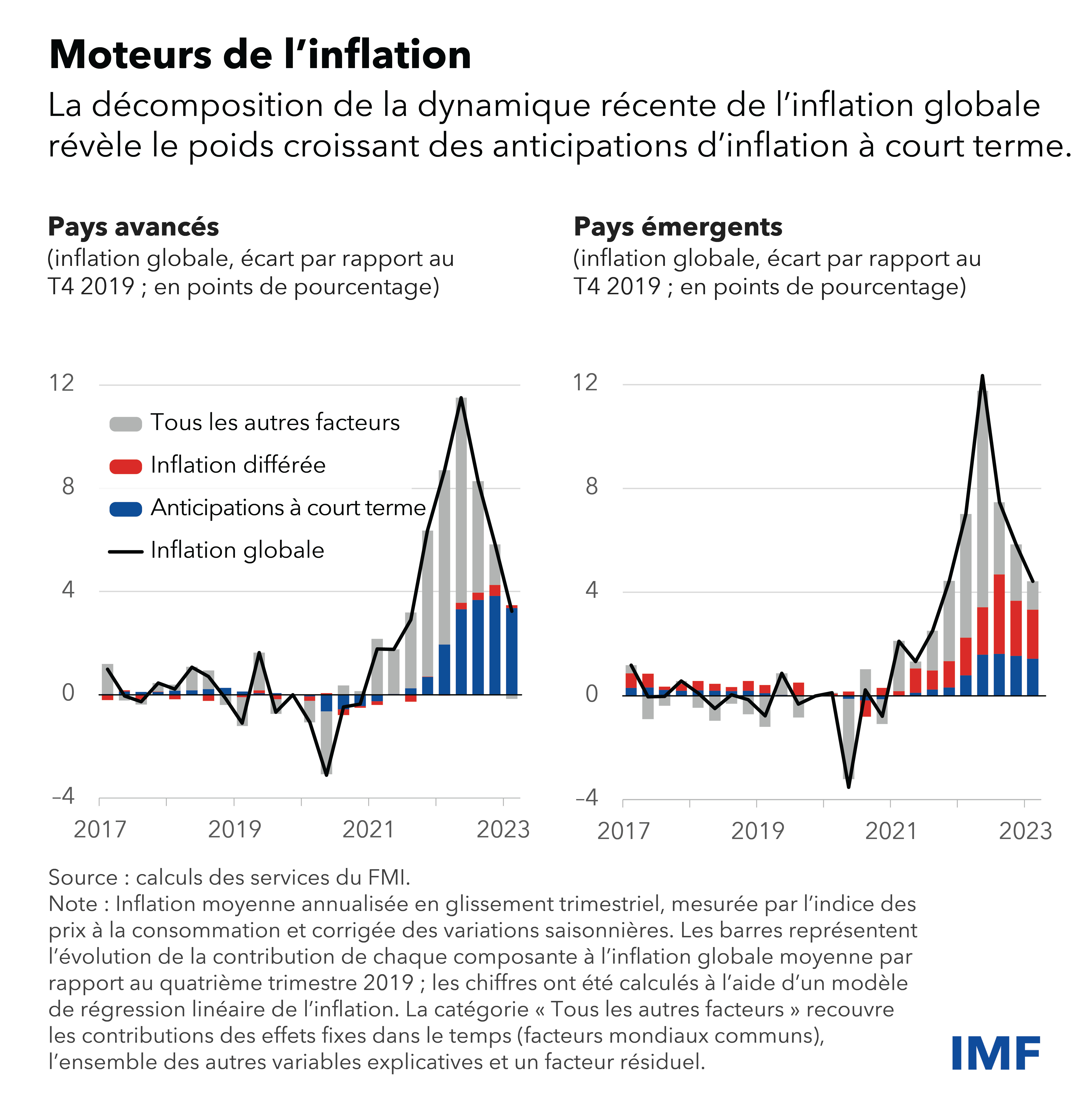 L’inflation a atteint dans le monde des niveaux jamais observés depuis des décennies. L’inflation globale ralentit de façon régulière, mais l’inflation sous-jacente (qui exclut l’alimentation et l’énergie) se révèle plus ancrée dans de nombreux pays et la croissance des salaires a accéléré.