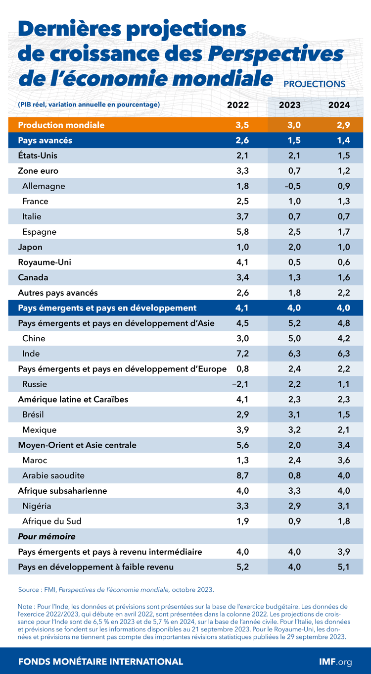 D’après nos dernières projections, la croissance mondiale va ralentir et passer de 3,5 % en 2022 à 3 % cette année, puis à 2,9 % l’année prochaine, ce qui représente une révision à la baisse de 0,1 point de pourcentage pour 2024 depuis juillet. Ces chiffres restent très inférieurs à la moyenne historique.