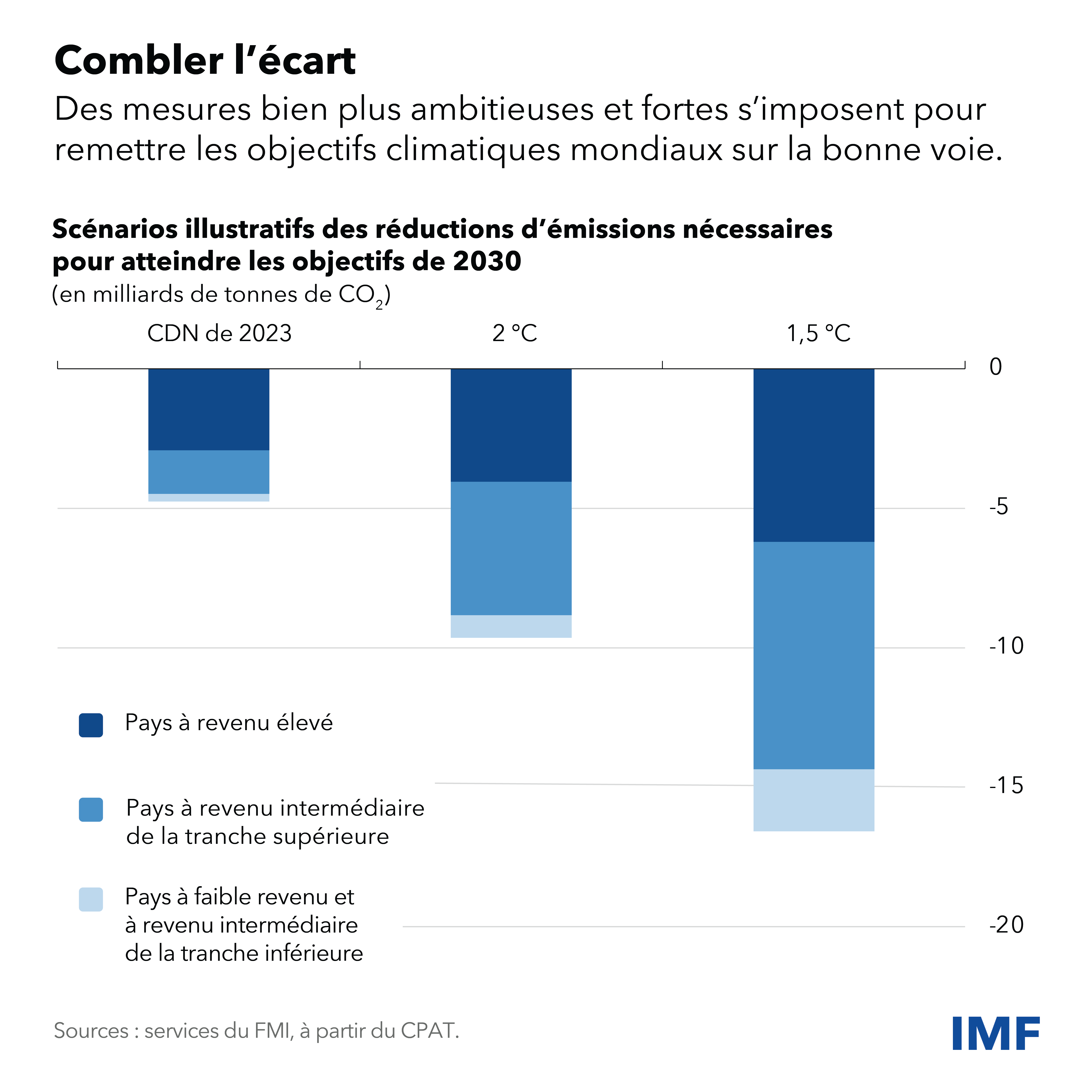 Par exemple, pour limiter le réchauffement à 2 degrés, les pays à revenu élevé, les pays à revenu intermédiaire de la tranche supérieure, les pays à revenu intermédiaire de la tranche inférieure et les pays à faible revenu devront réduire leurs émissions de respectivement 39 %, 30 %, 8 % et 8 % d’ici à 2030. Pour que le réchauffement reste inférieur à 1,5 degré, il faudrait que les émissions diminuent de manière plus draconienne, à hauteur de respectivement 60 % et 51 % pour les pays des deux premières catégories.
