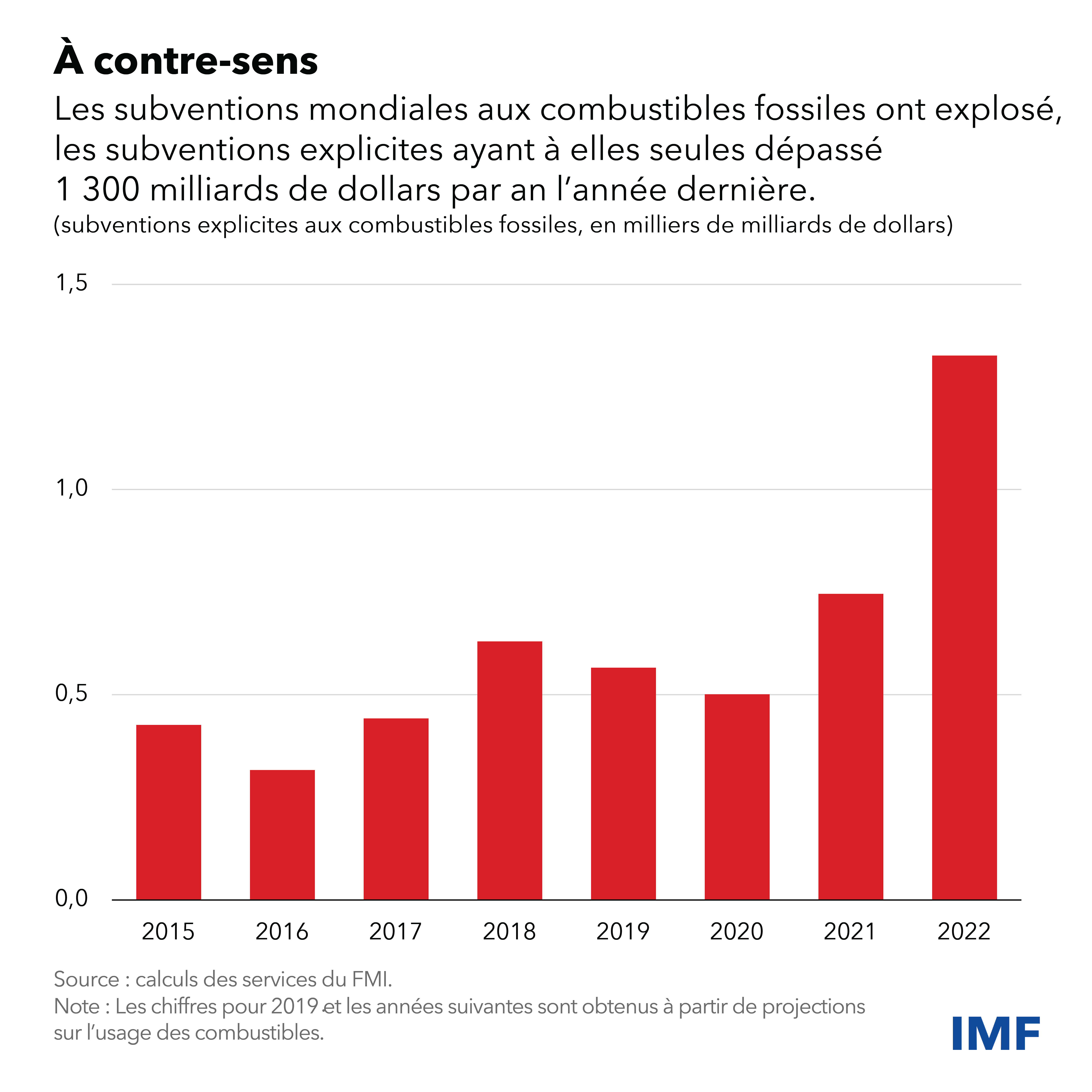Faire payer les émissions de carbone génère aussi des recettes budgétaires largement suffisantes pour venir en aide aux catégories vulnérables. Environ 20 % des recettes tirées de la tarification du carbone peuvent amplement dédommager les 30 % de ménages les plus pauvres. Cela contraste fortement avec les subventions aux combustibles fossiles, très préjudiciables, qui ont atteint un niveau record de 1 300 milliards de dollars par an sous la forme de coûts budgétaires directs uniquement. Les pays doivent s’employer à supprimer progressivement ces subventions.