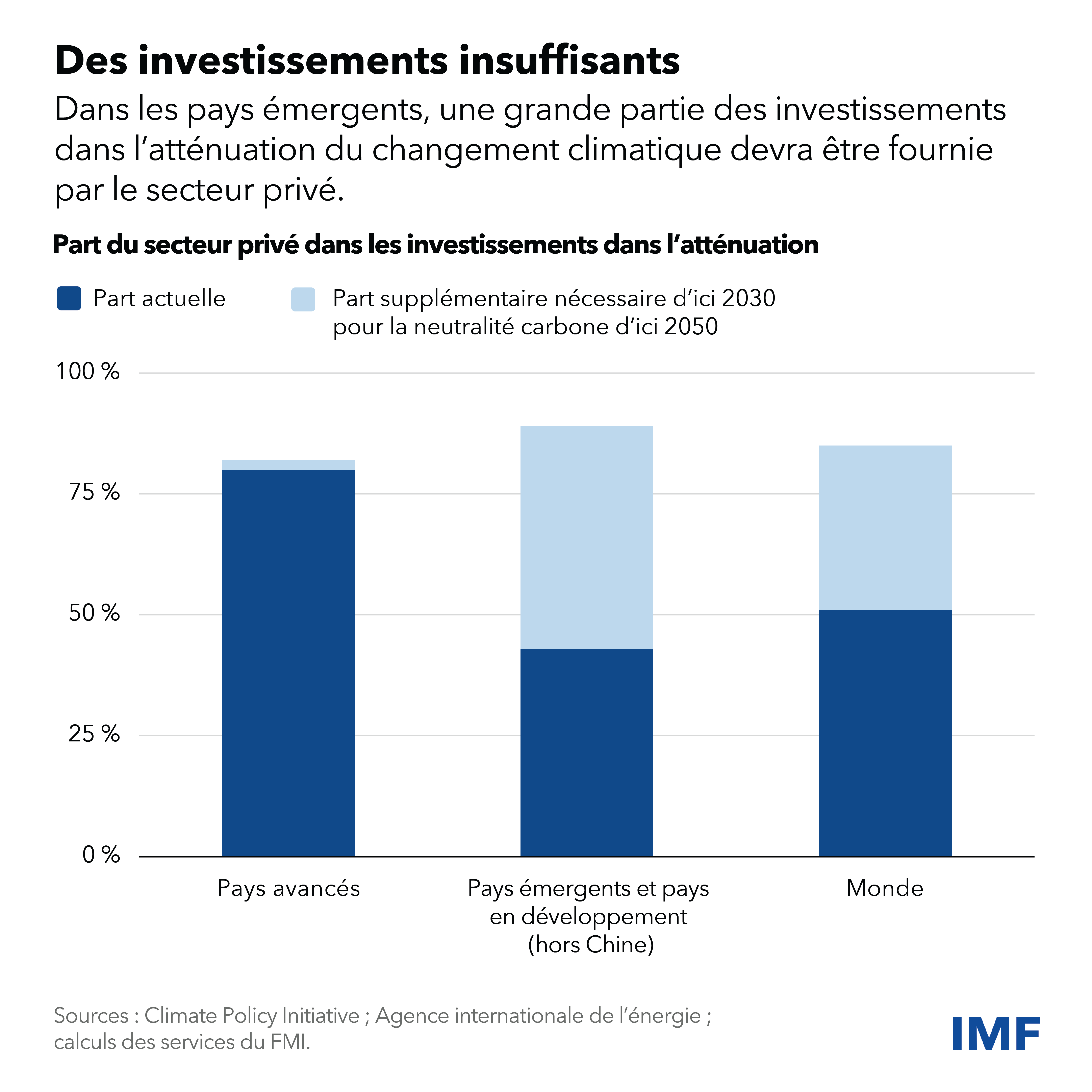 La trajectoire vers la neutralité carbone d’ici à 2050 nécessite d’accroître les investissements à bas carbone, de 900 milliards de dollars en 2020 à 5 000 milliards de dollars par an d’ici à 2030. Sur ce chiffre, les pays émergents et les pays en développement (PEPD) ont besoin de 2 000 milliards de dollars par an, soit cinq fois plus qu’en 2020. Même si les pays avancés tiennent leur promesse de verser 100 milliards de dollars par an ou vont un peu au-delà, les financements pour ces investissements à bas carbone devront pour l’essentiel venir du secteur privé.