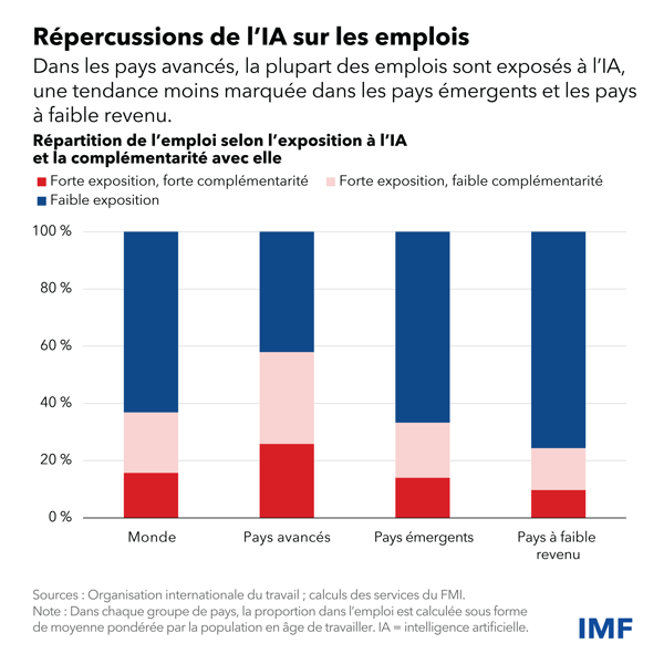 Dans les pays avancés, l’IA pourrait avoir des incidences sur environ 60 % des emplois. Parmi les emplois exposés, environ la moitié pourrait bénéficier de l’intégration de l’IA, qui se traduirait par un gain de productivité. Pour l’autre moitié, les applications de l’IA pourraient exécuter des tâches essentielles actuellement assurées par des êtres humains, ce qui pourrait diminuer la demande de main-d’œuvre, faire baisser les salaires et réduire les embauches. Dans les cas extrêmes, certains de ces emplois pourraient être amenés à disparaître.