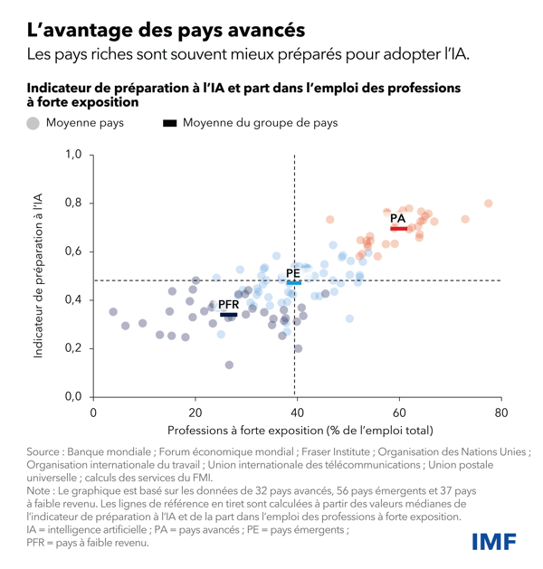 En revanche, l’exposition à l’IA devrait s’établir à 40 % dans les pays émergents et à 26 % dans les pays à faible revenu. Ces conclusions laissent entendre que l’IA donnera lieu à moins de bouleversements immédiats dans les pays émergents et les pays en développement. Il faut dire que nombre de ces pays ne disposent ni de l’infrastructure ni de la main-d’œuvre qualifiée pour tirer parti des bienfaits de l’IA, ce qui accentue le risque de voir la technologie aggraver les inégalités entre les pays au fil du temps.