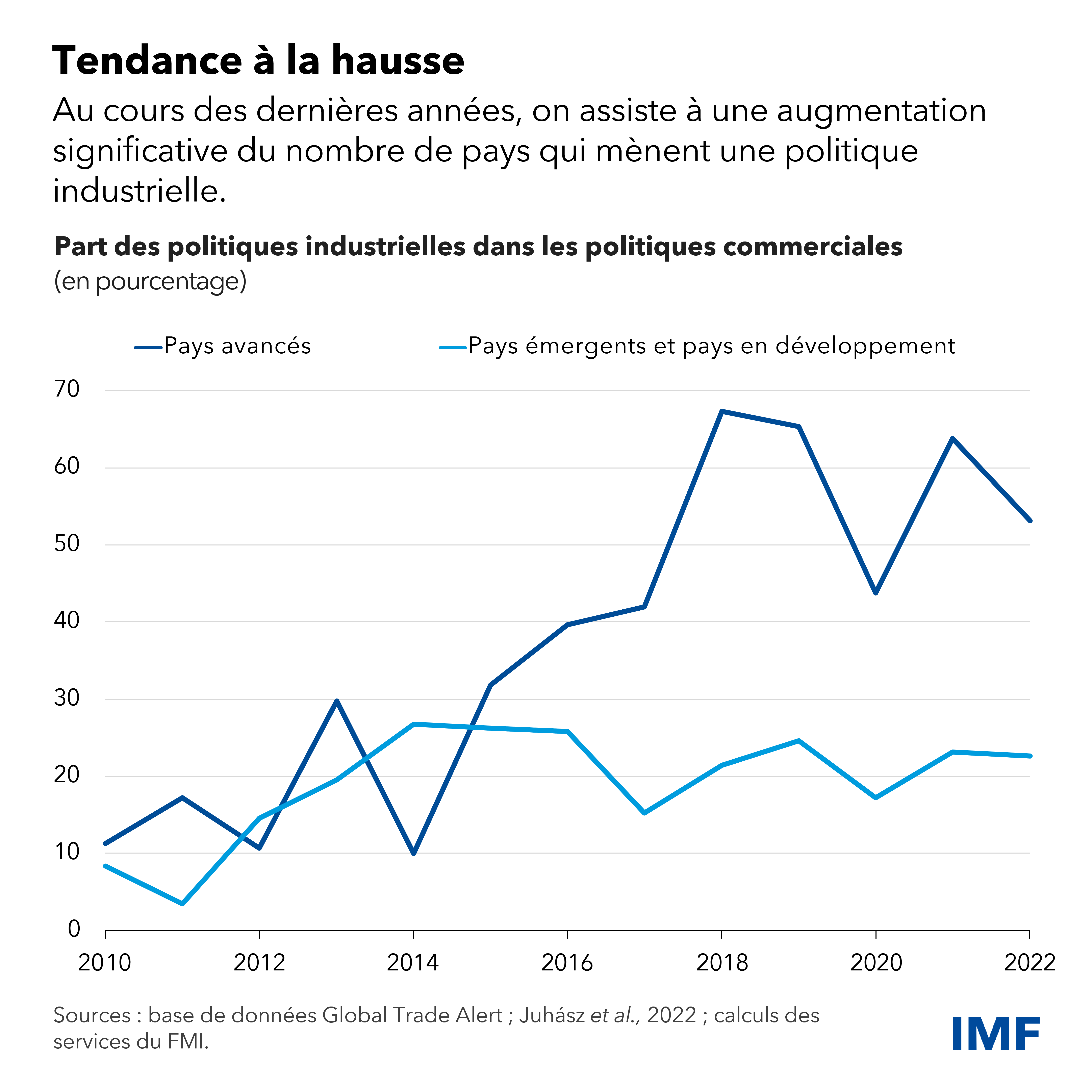 Sur fond de préoccupations sécuritaires, bon nombre de pays intensifient leur politique industrielle afin de promouvoir l’innovation dans des secteurs spécifiques et dans l’espoir de relancer la productivité et la croissance à long terme. Des initiatives majeures voient le jour dans le monde entier, à l’instar du CHIPS and Science Act aux États-Unis, qui investira dans la recherche et la production de semi-conducteurs au niveau national, du plan industriel du Pacte vert en Europe, qui entend soutenir la transition de l’Union européenne vers la neutralité climatique, de la nouvelle orientation de l’économie et de la politique industrielle au Japon ou encore du K-Chips Act en Corée, sans compter les politiques adoptées de longue date dans des pays émergents comme la Chine.