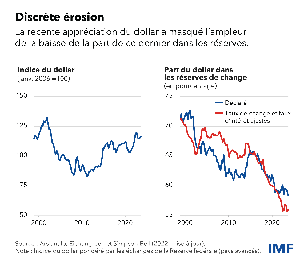 La prédominance du dollar (ou le rôle démesuré du dollar dans l’économie mondiale) a encore récemment pu être observée, étant donné que la robustesse de l’économie américaine, le resserrement de la politique monétaire et l’intensification des risques géopolitiques ont contribué à valoriser davantage le billet vert. Parallèlement à cela, la fragmentation économique et la potentielle réorganisation de l’activité économique et financière mondiale en blocs distincts pourraient encourager certains pays à utiliser et à détenir d’autres monnaies internationales et de réserve.