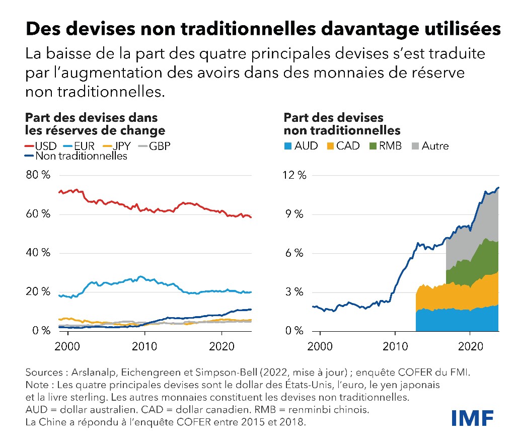 Les récentes données provenant du rapport du FMI sur la composition en devises des réserves de change (COFER) indiquent une baisse progressive continue de la part du dollar dans les réserves de change des banques centrales et des États. Il est frappant de constater que la baisse de la part du dollar au cours des deux dernières décennies n’a pas été contrebalancée par l’augmentation des parts des autres principales monnaies, que sont l’euro, le yen et la livre. Au lieu de cela, c’est la part de ce que nous appelons les « monnaies de réserve non traditionnelles » qui a augmenté, notamment celle du dollar australien, du dollar canadien, du renminbi chinois, du won sud-coréen, du dollar singapourien et des devises nordiques. Les données les plus récentes confirment cette tendance, que nous avions déjà soulignée dans un précédent document de travail et un article de blog du FMI.