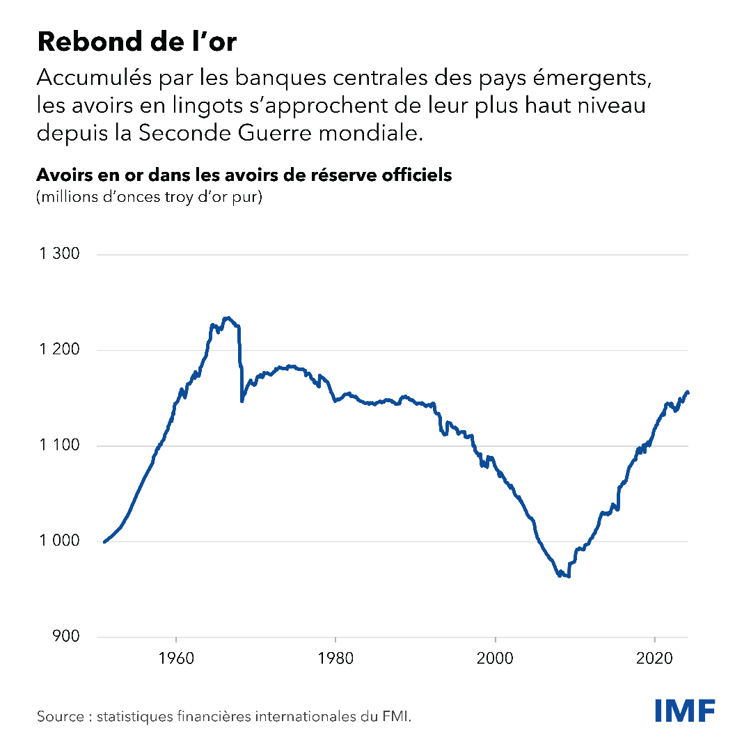Nous avons aussi constaté que les sanctions financières imposées par le passé incitaient les banques centrales à délaisser légèrement leurs portefeuilles de réserves (ces derniers risquant d’être gelés et redéployés) au profit de l’or, qui peut être stocké dans le pays et ne risque donc pas d’être affecté par une quelconque sanction. Ces travaux ont également montré que la demande d’or émanant des banques centrales est restée positive malgré les incertitudes entourant la politique économique et le risque géopolitique à l’échelle mondiale. Ces facteurs peuvent être à l’origine de l’accumulation d’or par un certain nombre de banques centrales dans les pays émergents. Cependant, avant de ne présager de quoi que ce soit, il est important de rappeler que la part de l’or dans les réserves reste à un niveau historiquement bas.