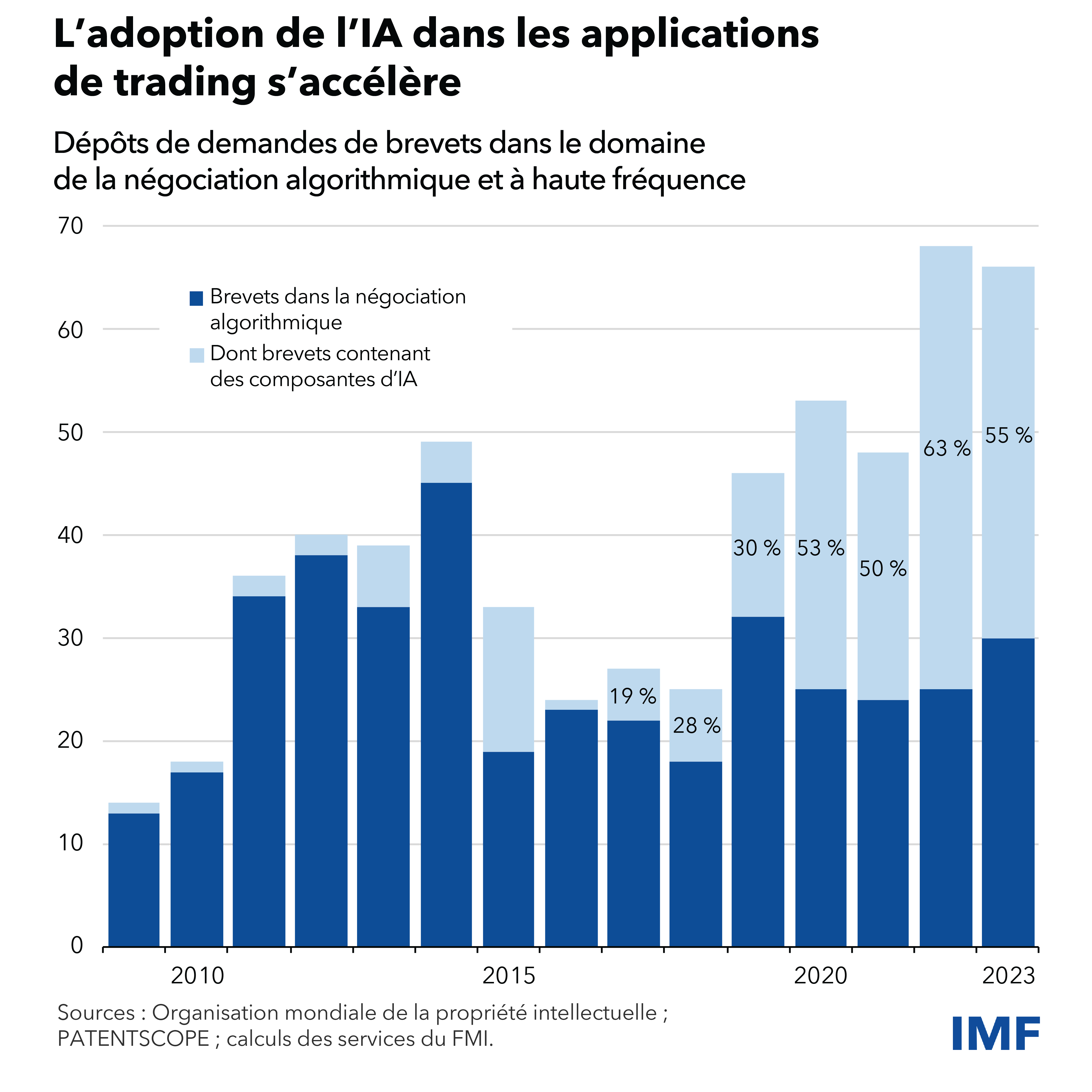 Les dépôts de demandes de brevets apportent un éclairage intéressant sur cette question car il s’écoule souvent beaucoup de temps entre les dépôts et la mise au point de technologies prêtes pour la production. Depuis les premières apparitions des grands modèles de langage, en 2017, la part des contenus utilisant l’IA dans les dépôts de demandes de brevets liées à la négociation algorithmique est passée de 19 % à plus de 50 % sur chaque année depuis 2020, ce qui présage l’arrivée d’une vague d’innovation dans ce domaine.
