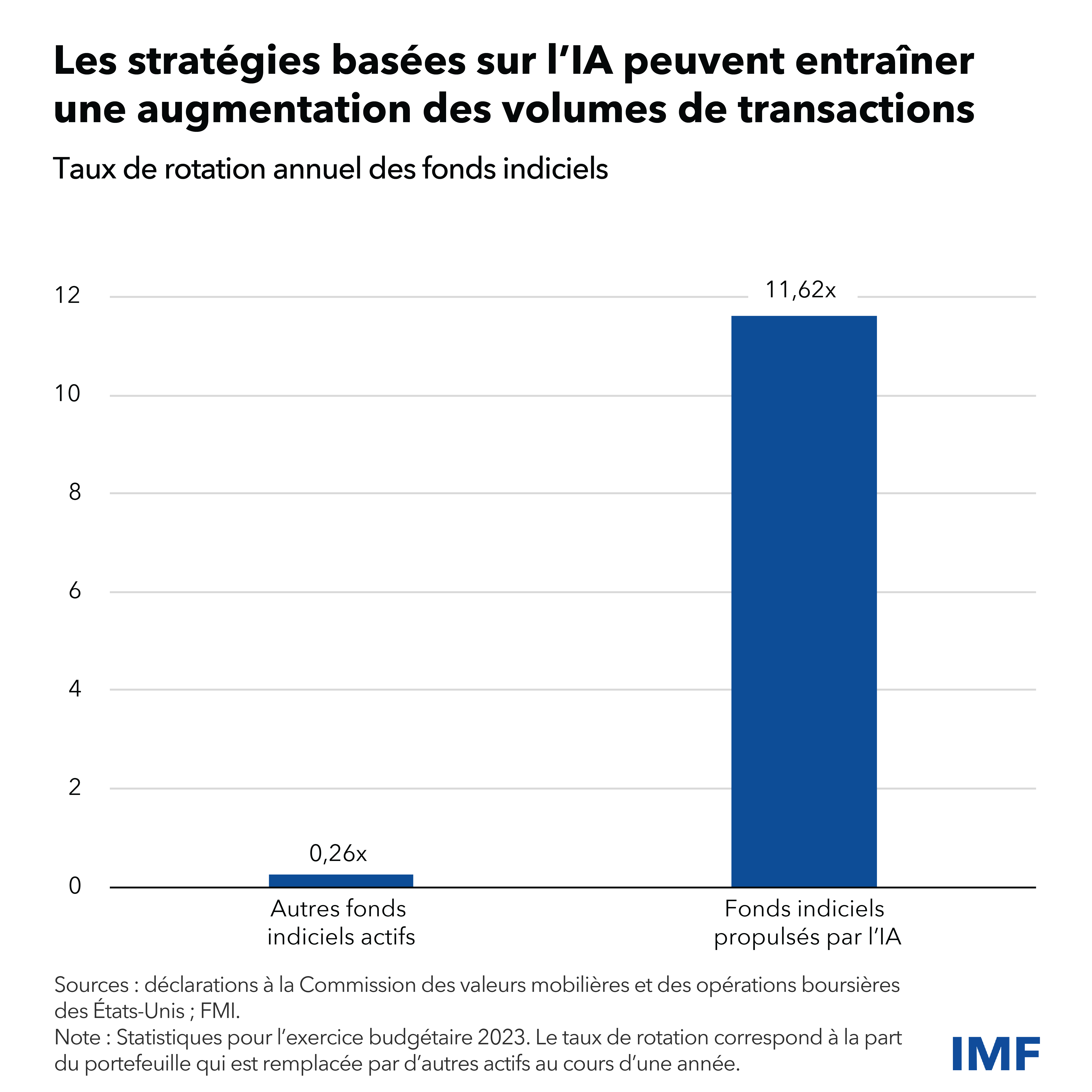 Ces changements se font déjà sentir sur le marché des fonds indiciels. Même s’ils sont de petite taille à l’heure actuelle, les fonds indiciels fonctionnant à l’IA affichent une rotation beaucoup plus importante que leurs homologues traditionnels. Alors qu’un fonds indiciel type investi en actions et géré de façon active opère une rotation de ses positions à une fréquence bien inférieure à une fois par an, les fonds indiciels propulsés par l’IA le font environ une fois par mois. Si elles se généralisent, ces stratégies pourraient augmenter la profondeur et la liquidité des marchés financiers à l’avenir, ce qui est une bonne chose pour les investisseurs. Mais elles pourraient aussi contribuer à l’instabilité des marchés : plusieurs fonds indiciels fonctionnant à l’IA ont ainsi connu une rotation accrue de leurs positions au cours des turbulences des marchés en mars 2020, ce qui donne à penser que les ventes d’actifs entraînées par des comportements grégaires pourraient augmenter en périodes de tension.