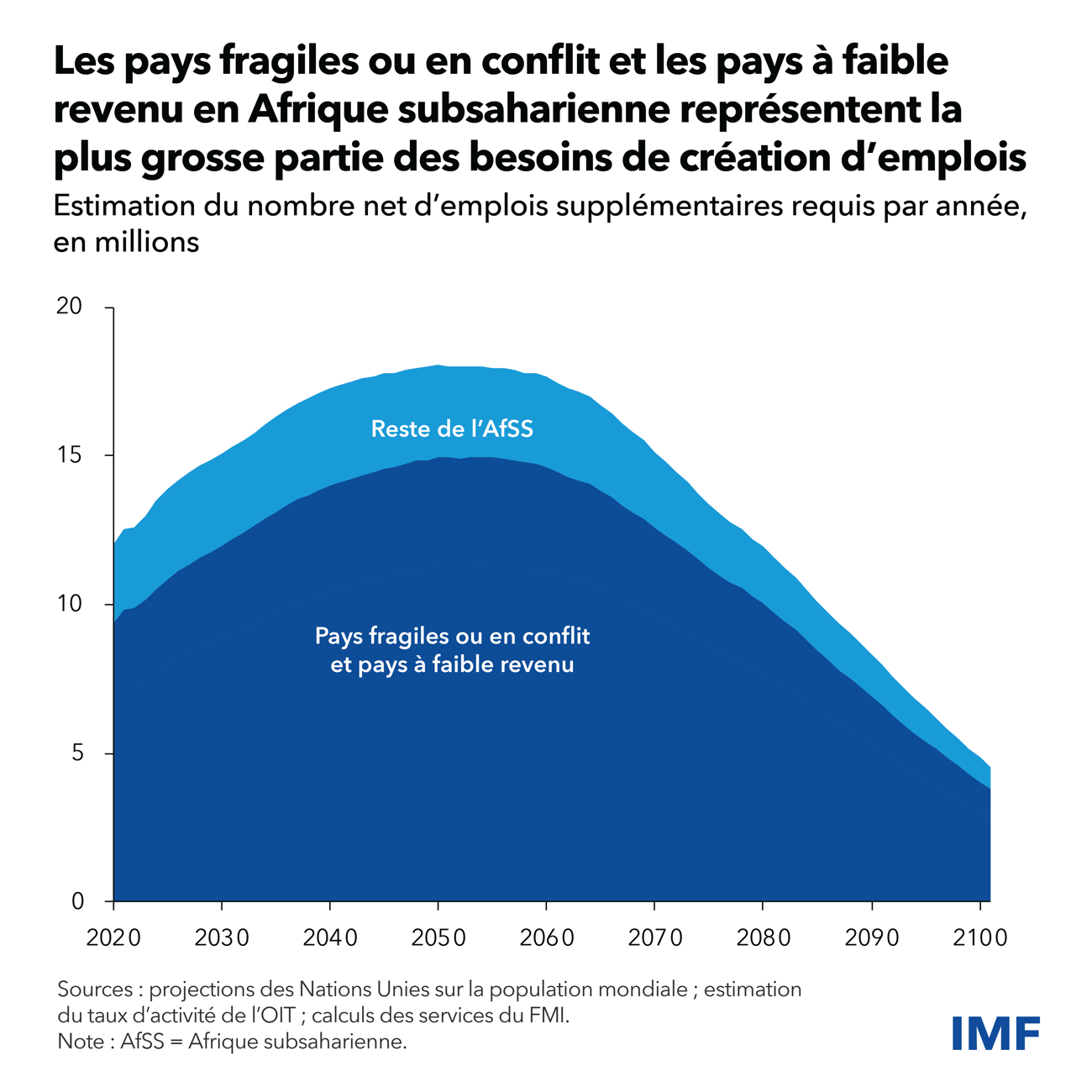 Comme le montre le graphique de la semaine, ce défi est encore plus grand pour les pays fragiles ou touchés par un conflit et les pays à faible revenu. Ces derniers représentent près de 80 % des besoins annuels de création d’emplois de la région, mais ils sont à ce jour ceux qui peinent le plus à créer des emplois.