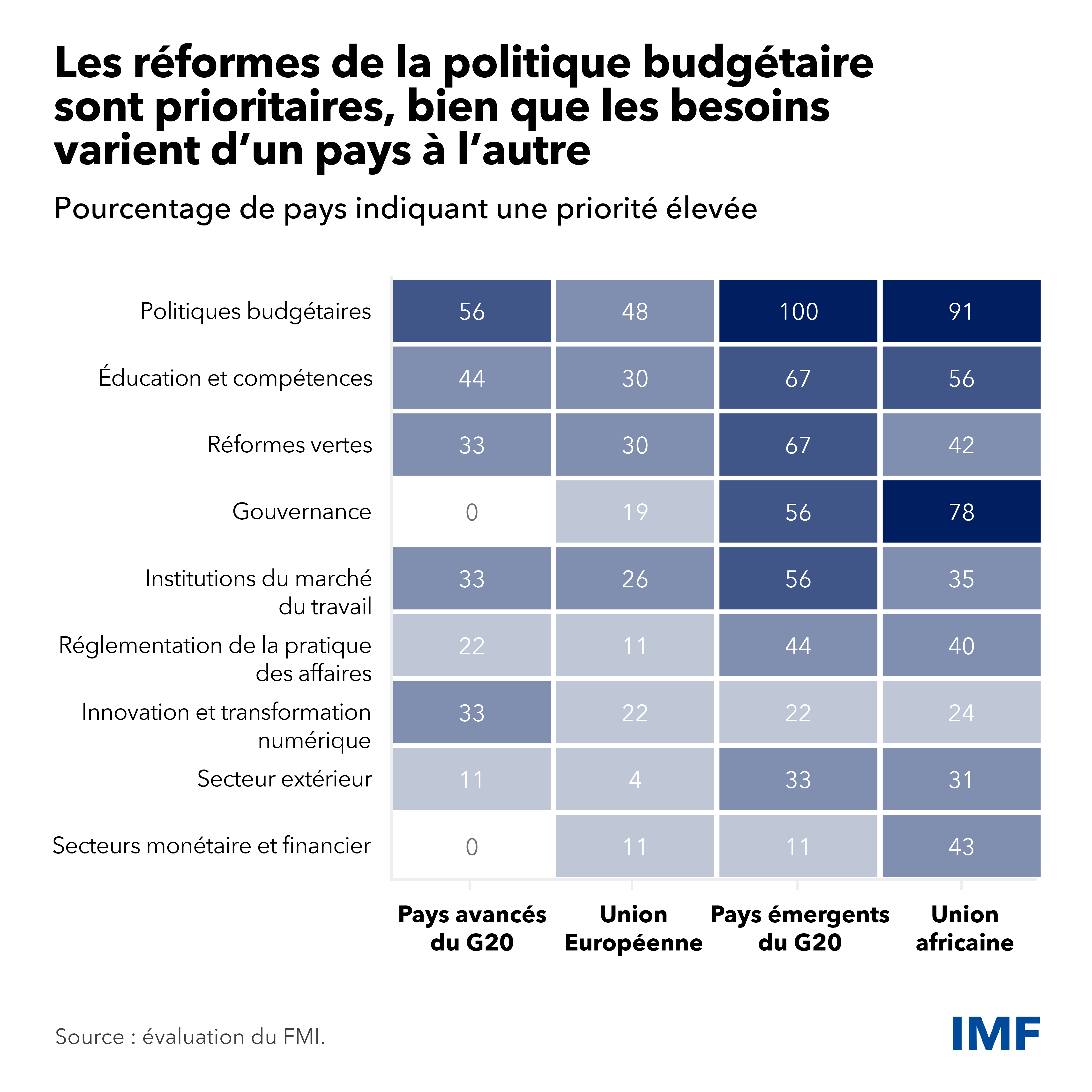 Comme le montre le graphique de la semaine, la priorité des pays de ces groupes est de réformer les cadres de politique budgétaire pour favoriser un rééquilibrage durable des budgets publics.