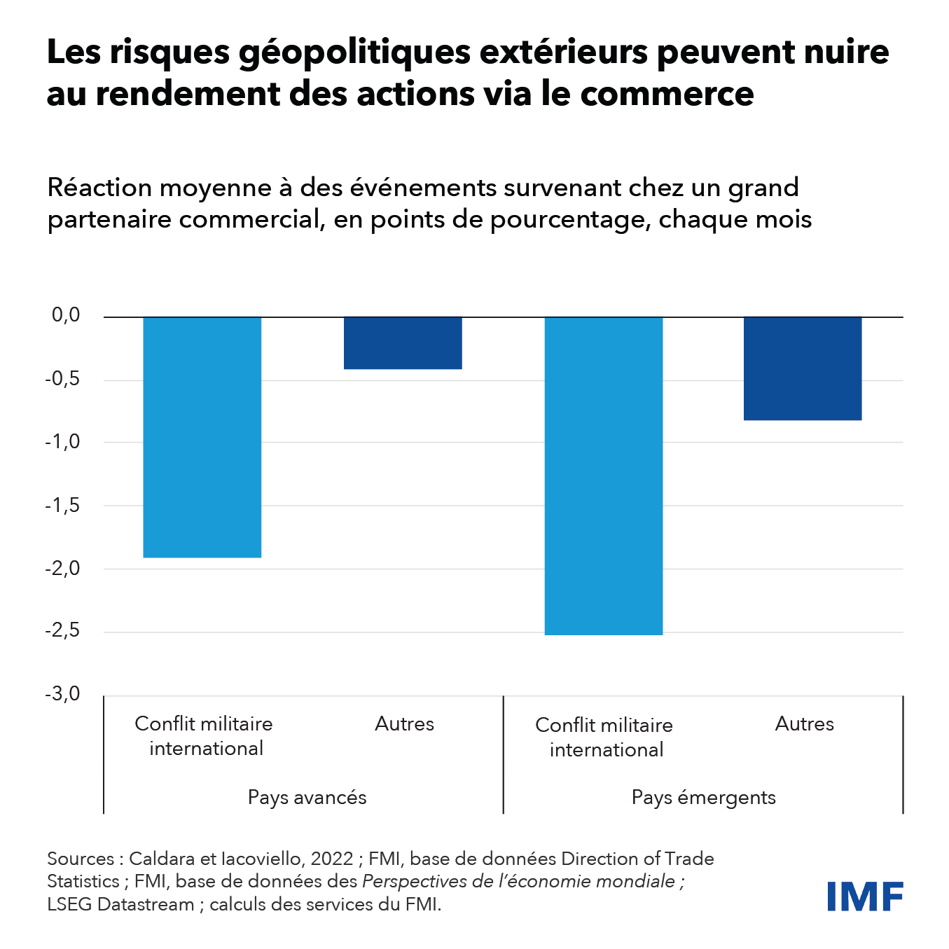 Les guerres, les tensions diplomatiques ou le terrorisme sont autant de chocs qui peuvent perturber les échanges et les investissements transfrontaliers. Cela peut nuire aux prix des actifs, se répercuter sur les institutions financières et réduire les prêts au secteur privé, ce qui pèse sur l’activité économique et met en péril la stabilité financière.