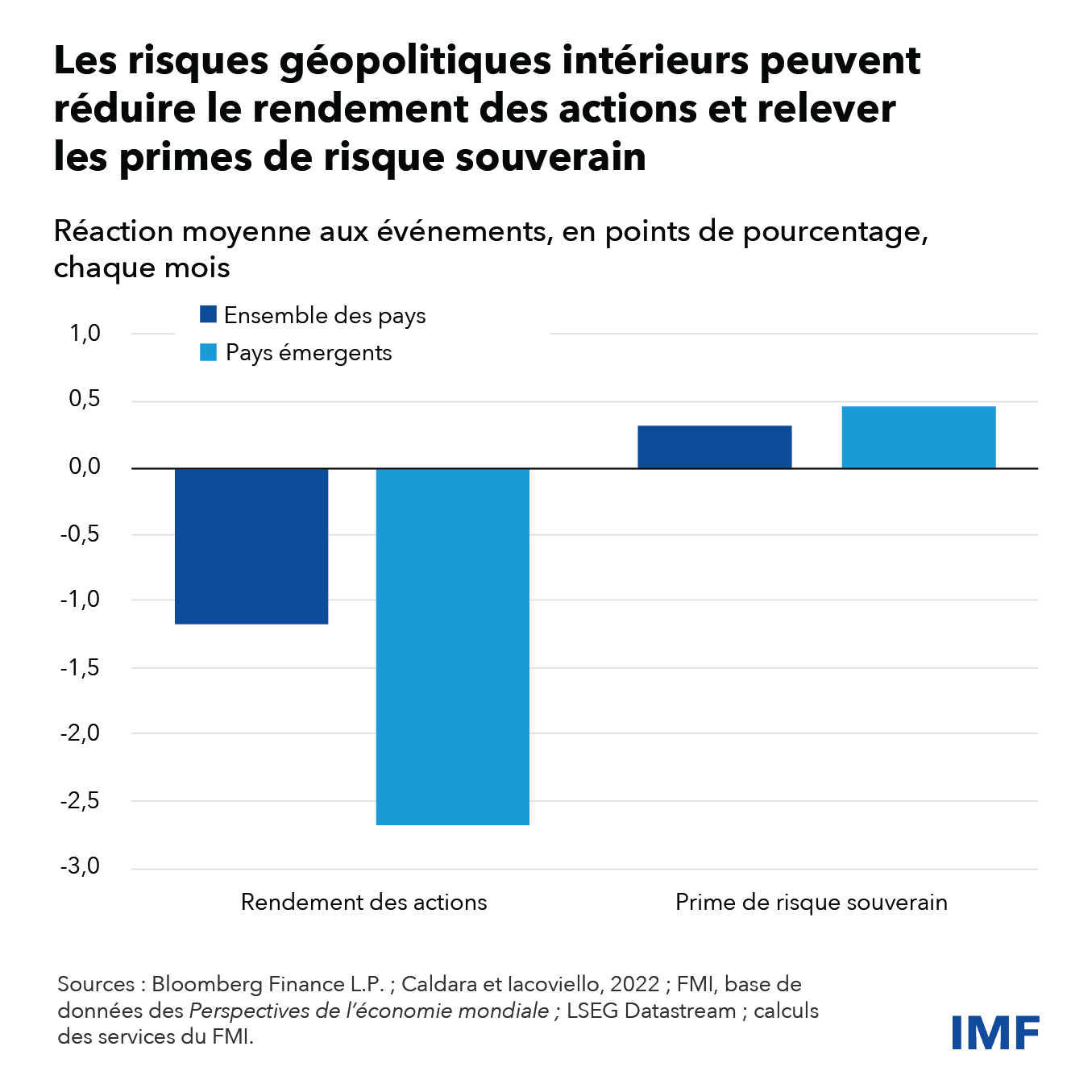 Une intensification des risques géopolitiques peut aussi se répercuter sur le secteur public alors que la croissance économique ralentit et les dépenses publiques enflent. Par conséquent, les primes de risque souverain, mesurées d’après les prix des dérivés de crédit qui protègent contre les défaillances, augmentent souvent après des événements géopolitiques, de l’ordre, en moyenne, de 30 points de base pour les pays avancés, et 45 points de base pour les pays émergents. Ces tensions financières s’exercent particulièrement dans les pays émergents, où les primes s’élèvent jusqu’à quatre fois plus.