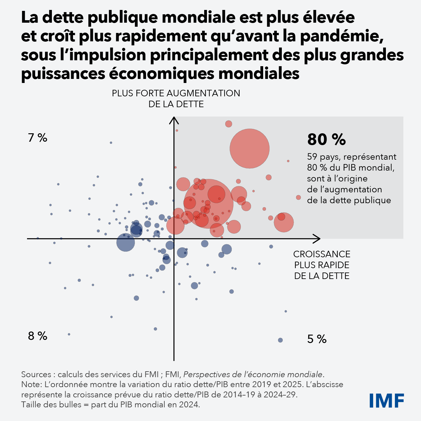 Le graphique de la semaine met en évidence qu’environ un tiers des pays, qui représentent 80 % du PIB mondial, affichent à la fois un niveau de dette publique supérieur à celui d’avant la pandémie et une trajectoire d’endettement plus rapide. Plus des deux tiers des 175 pays analysés supportent désormais une charge de la dette publique plus lourde qu’en 2020, au moment de l’émergence de la COVID-19.