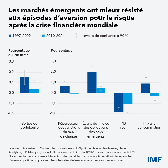 L’amélioration des cadres d’action — une politique monétaire crédible, des banques centrales plus indépendantes et une politique budgétaire plus transparente — a joué un rôle important, comme nous le montrons dans un chapitre de la dernière édition des Perspectives de l'économie mondiale. Notre analyse compare des épisodes d’aversion pour le risque représentatifs avant et après la crise financière mondiale, et conclut qu’une amélioration des cadres d’action a contribué à réduire les pertes de production et à faire baisser l’inflation.