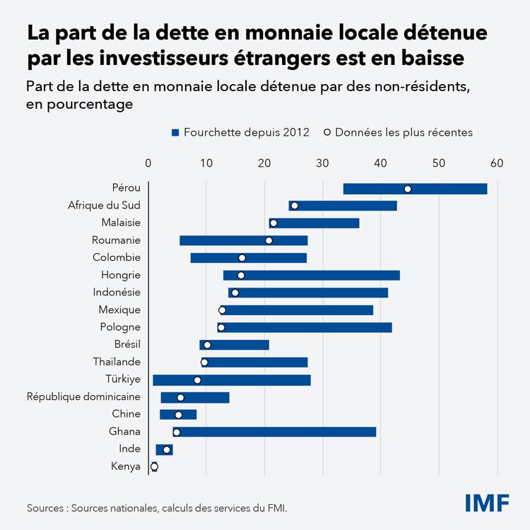 Les grands marchés émergents dotés de cadres d’action solides et dont l’épargne intérieure augmente ont pu faire davantage appel à l’émission de dette en monnaie nationale et à la forte demande des investisseurs nationaux, en particulier les institutions financières non bancaires. C’est pourquoi la part de la dette émise en monnaie locale et détenue par des investisseurs étrangers a chuté pour atteindre des niveaux jamais atteints depuis plusieurs années dans de nombreux pays.