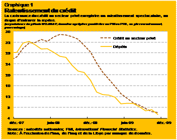 « Les systèmes bancaires des pays exportateurs de pétrole de la région ne sont cependant pas tirés d’affaire. Le crédit au secteur privé reste atone et les pertes sur prêts improductifs n’ont pas encore été entièrement comptabilisées» a ajouté M. Ahmed. Après avoir connu une longue période de forte croissance jusqu’au milieu de 2008, le crédit dans ces pays avait accusé un repli de près 30 points de pourcentage en moyenne à fin 2009 (graphique 1). Les gouvernements devront concilier l’objectif de la reprise du crédit et la nécessité d’un renforcement de la réglementation financière et d’une amélioration de la supervision, notamment dans les pays où, manifestement, la prise de risques a été excessive.