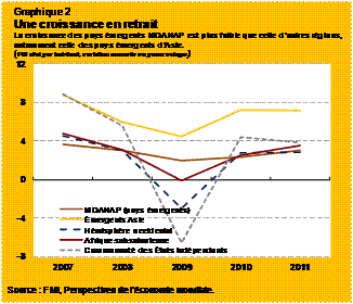 Les pays émergents de la région — Afghanistan, Djibouti, Égypte, Jordanie, Liban, Maroc, Mauritanie, Pakistan, Syrie et Tunisie — se redressent après le ralentissement de l’année dernière, mais la croissance reste inférieure à ce qu’elle devrait être pour réduire le niveau élevé du chômage. Le caractère limité des liens financiers et commerciaux de ces pays avec l’extérieur et les retombées positives de la relance budgétaire opérée par les pays exportateurs de pétrole de la région MOANAP ont contribué à amortir l’impact de la récession mondiale. De ce fait, la croissance globale n’a accusé qu’un repli modeste, revenant à 3,8 % en 2009, contre 5 % en 2008.