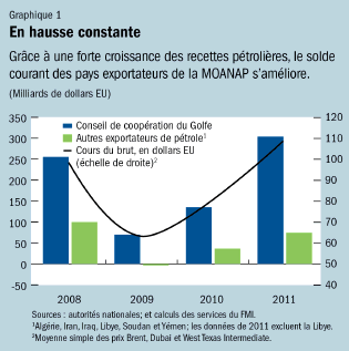 Grâce à l’augmentation des cours et de la production de pétrole, le solde global des transactions courantes des pays exportateurs de pétrole devrait plus que doubler pour se chiffrer à 380 milliards de dollars en 2011 (Libye non comprise) (voir graphique 1). Globalement, ces économies devraient se développer, leur PIB réel collectif progressant, d’après les projections, de 4,9 % en 2011. Si la croissance du PIB hors pétrole devrait rester stable à 3,5 % pour l’ensemble de ce groupe de pays, la hausse des dépenses dans les pays du CCG fera monter la croissance du PIB hors pétrole à 5,3 % en 2011, contre 4,2 % en 2010. Malgré l’augmentation des dépenses, les positions budgétaires vont s’améliorer, car le surcroît de dépenses publiques sera plus que compensé par la progression des recettes pétrolières. En dépit de ces perspectives globalement positives, les pays exportateurs de pétrole de la région continuent de se heurter à des redoutables problèmes structurels, tels que la nécessité de diversifier davantage leurs économies, de créer des emplois pour leur population, de poursuivre le développement du secteur financier pour soutenir la croissance économique et d’améliorer la gestion des ressources publiques.